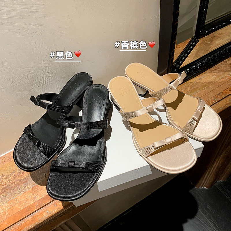 蝴蝶结高跟鞋水钻真丝一字带仙女风凉鞋百搭粗跟凉拖鞋女夏季外穿