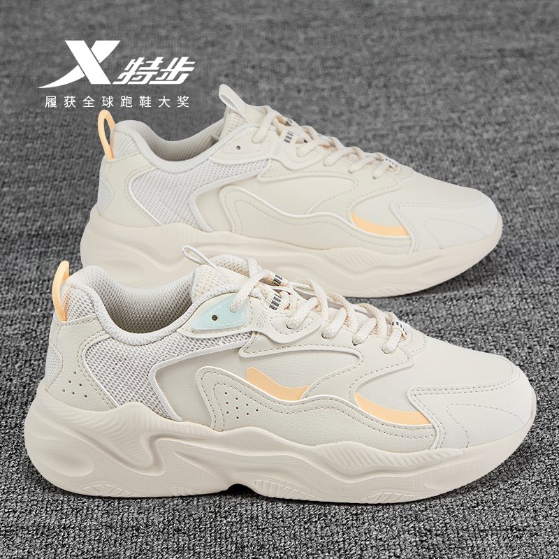 特步女鞋2025新款皮面防水老爹鞋轻便减震跑步鞋软底健身运动鞋子