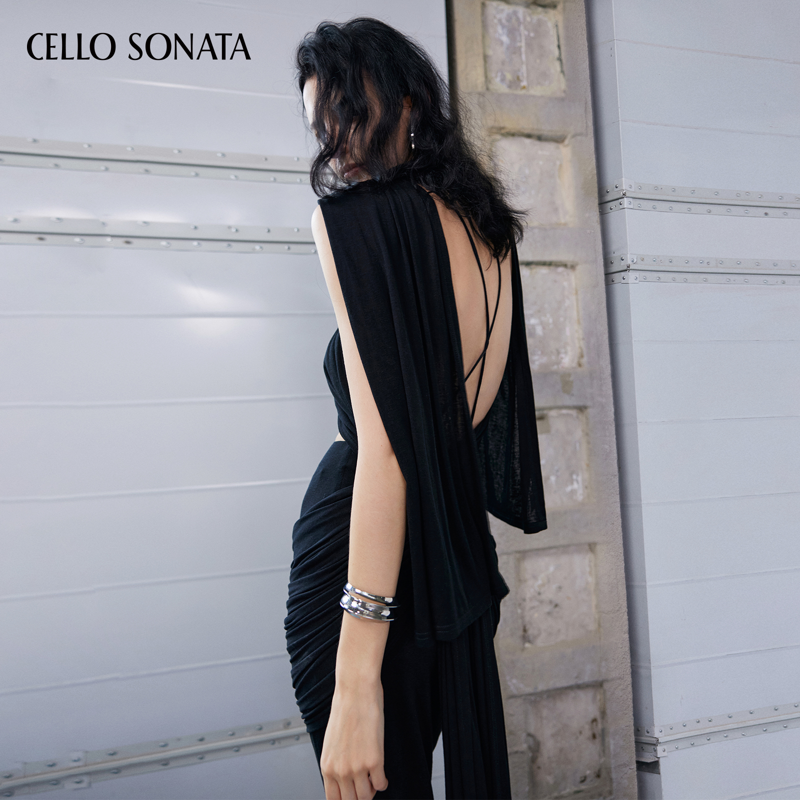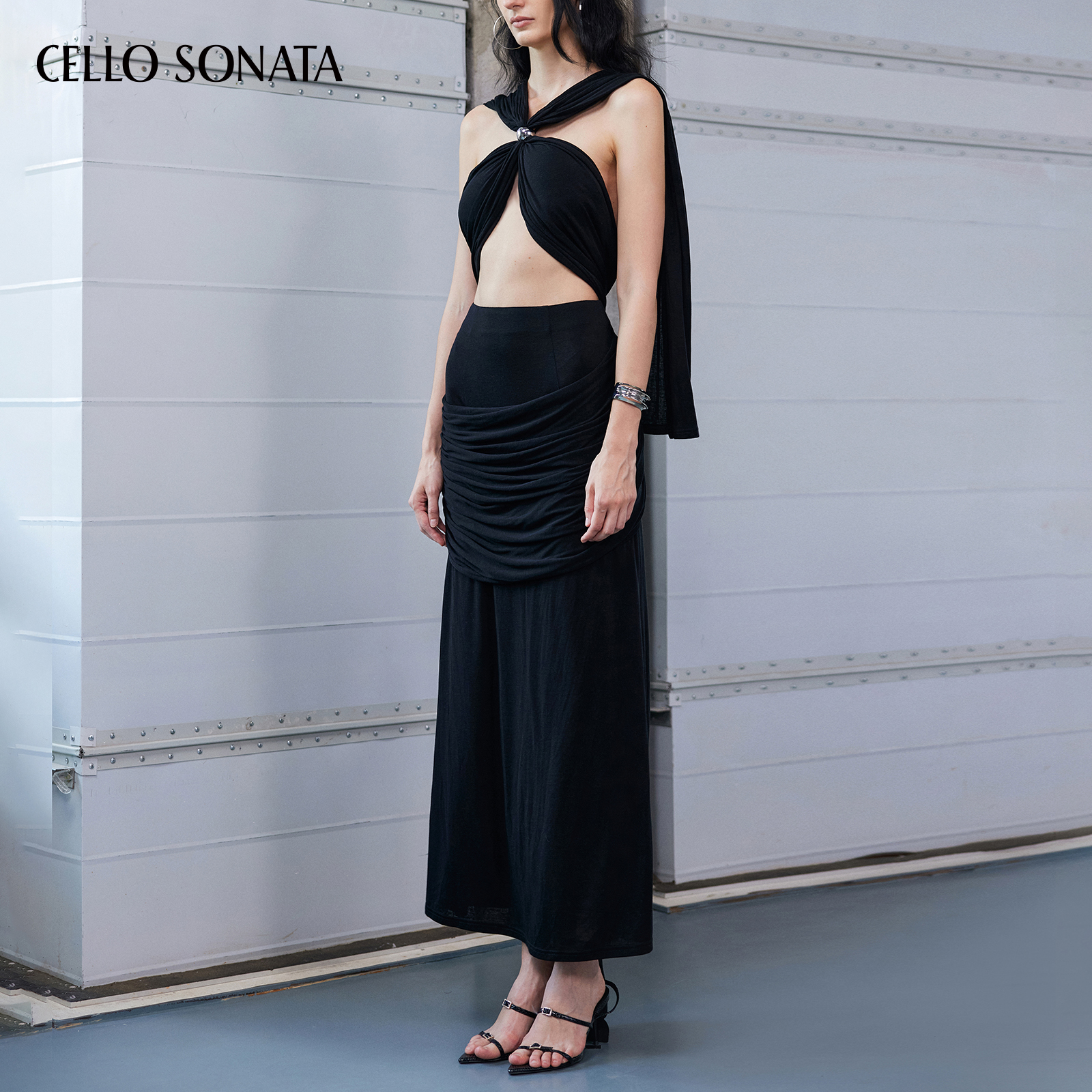 Cello SonataTS5早春系列 黑色露腰褶皱挂脖针织连衣裙宴会长裙