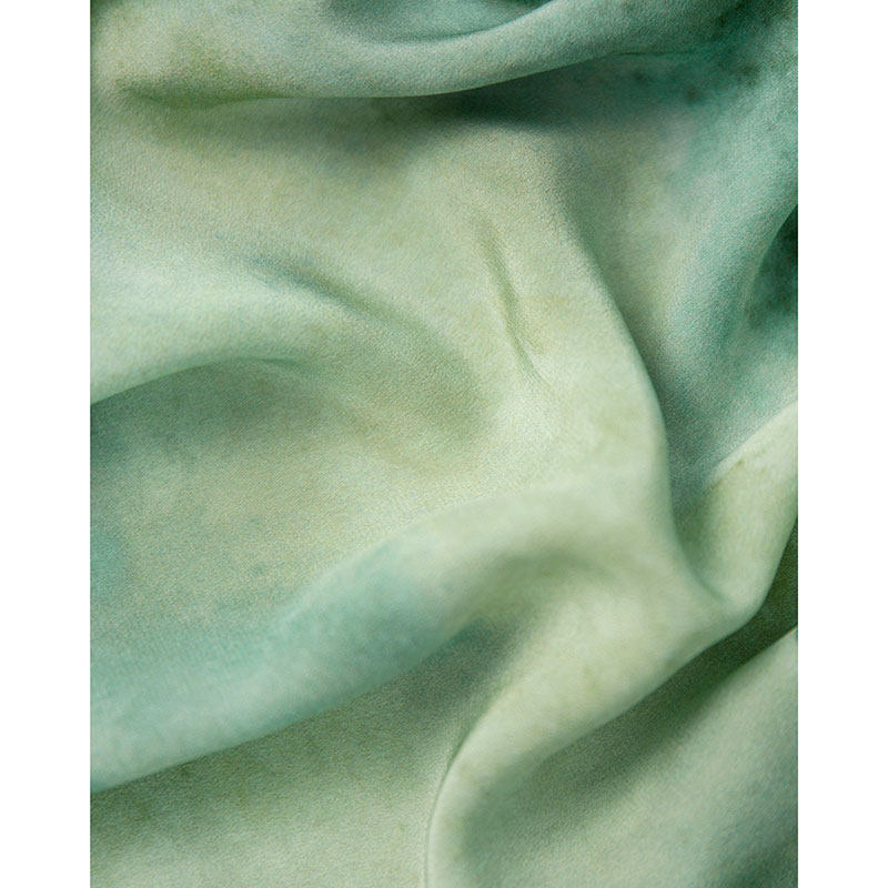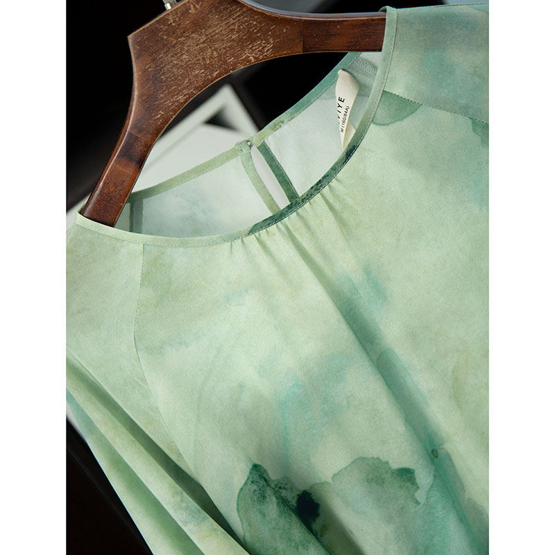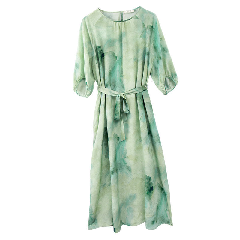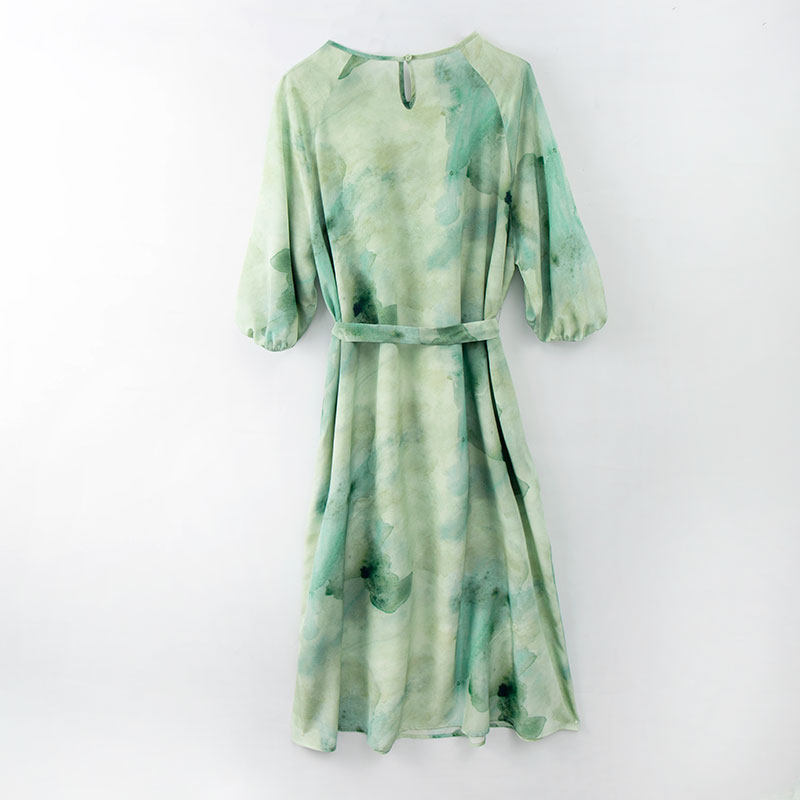 丝艺 100%桑蚕丝双绉真丝绿色水墨画连衣裙圆领七分灯笼袖a字裙春