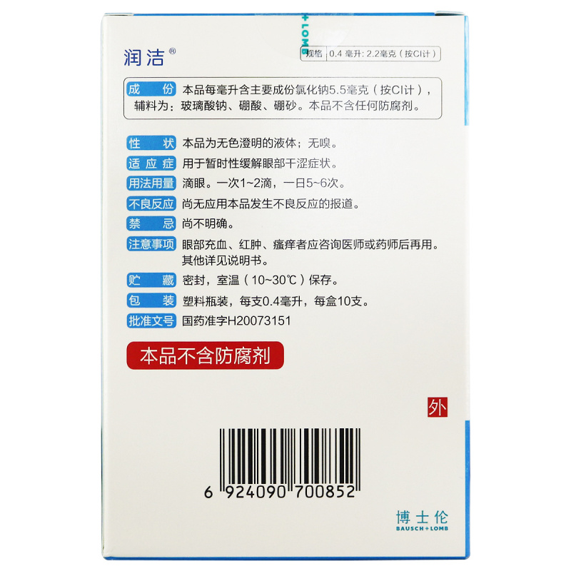 润洁博士伦氯化钠滴眼液玻璃酸钠眼药水温润眼表缓解眼干涩无防腐
