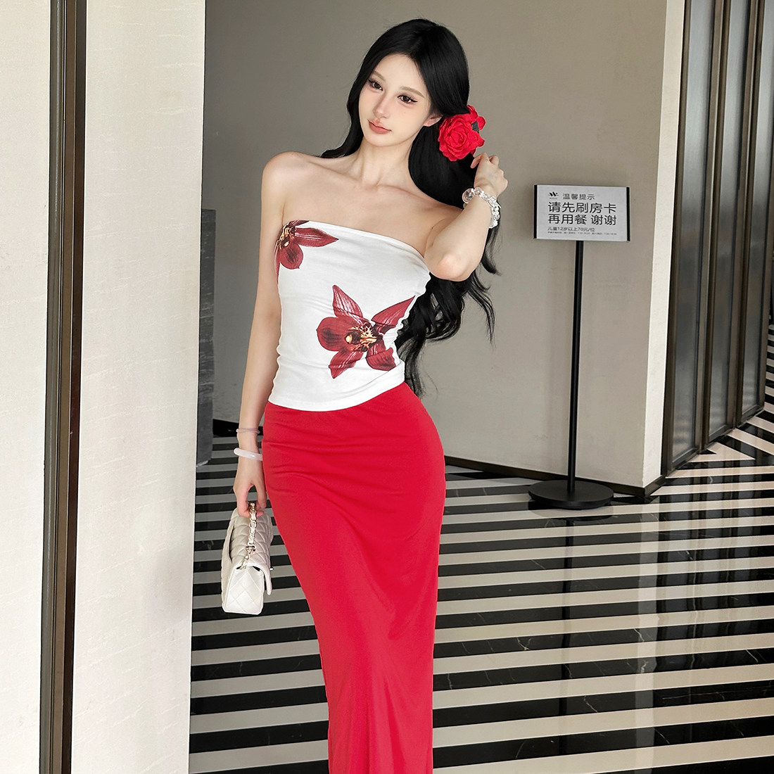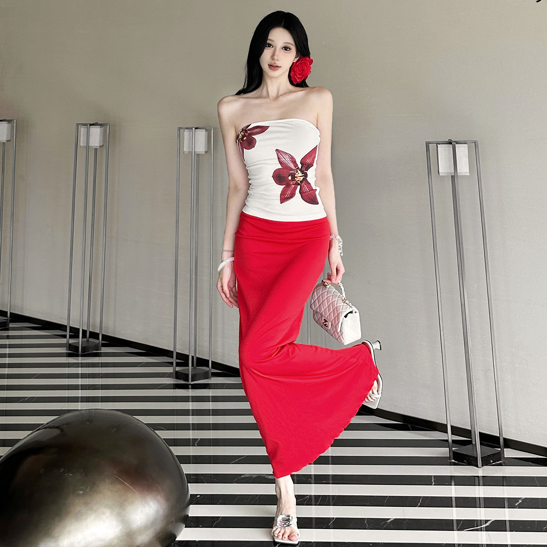 WEIRD PUSS 明艳大女主花朵印花抹胸背心女 修身半身裙辣妹套装潮