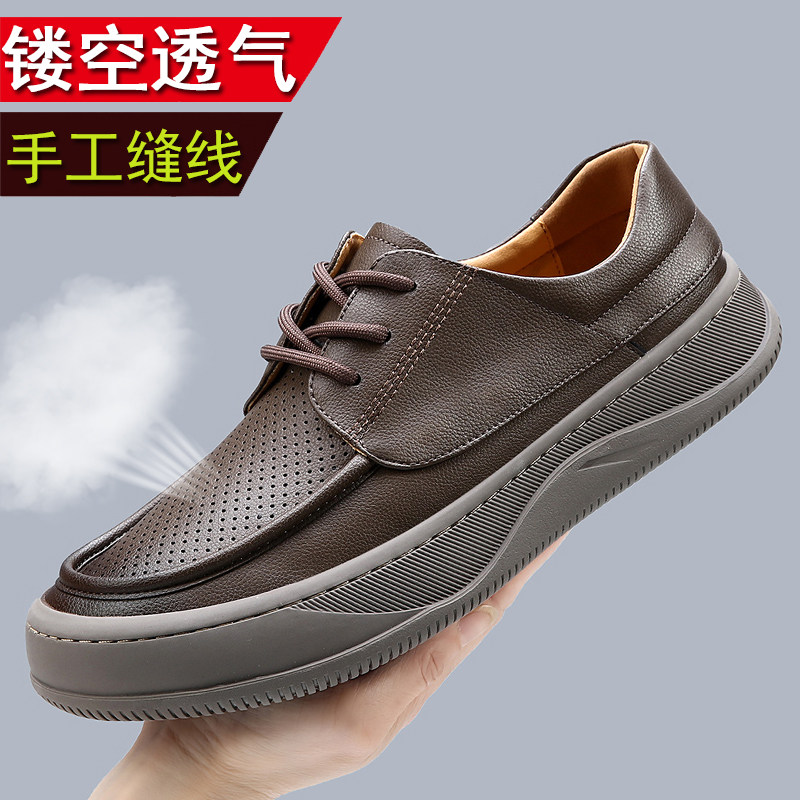 男鞋2025新款夏季真皮透气休闲皮鞋男士百搭厚底镂空打孔皮凉鞋男