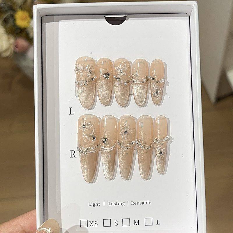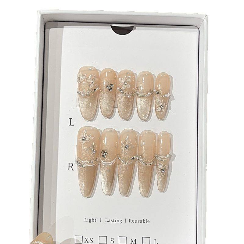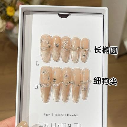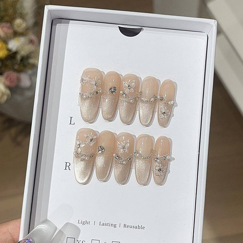 鸢尾蝶纯欲风灵动冰透蝴蝶链条珍珠碎钻渐变爆闪裸色猫眼穿戴甲