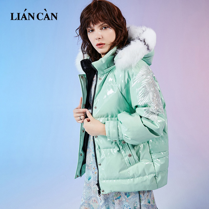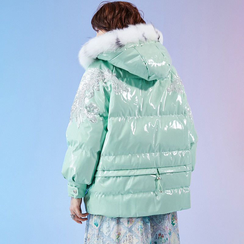 莲灿outlets秋冬新商场同款宽松减龄百毛领连帽珠片绣中长款羽绒
