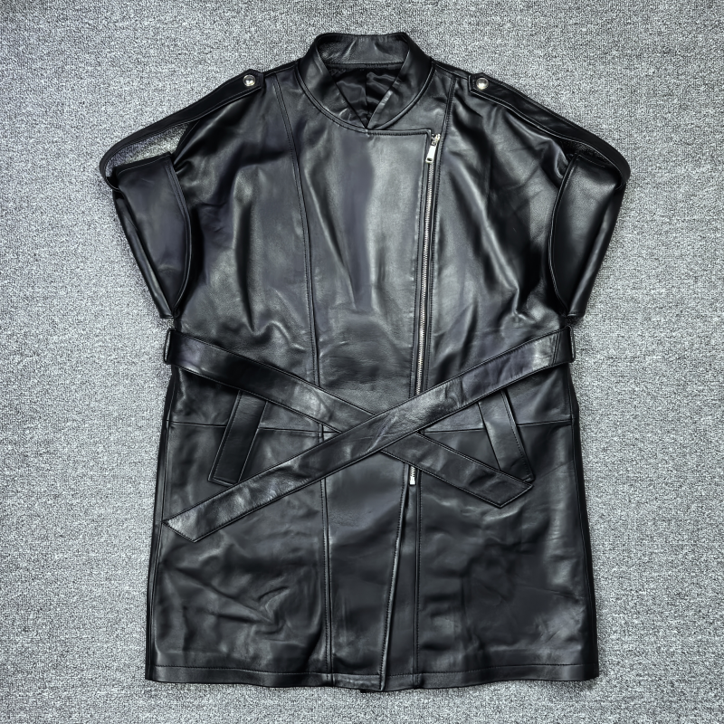 真皮中长款西装领绵羊皮中长款皮衣女短袖收腰系带显瘦外套2025春