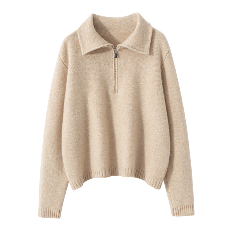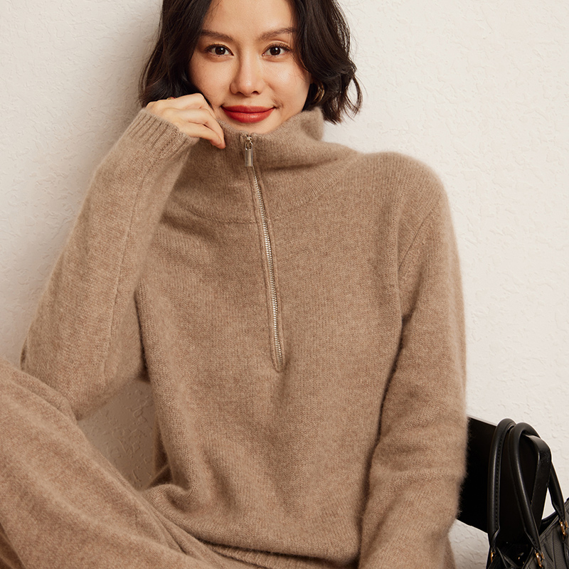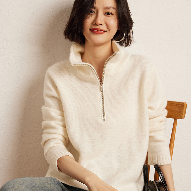 2024冬季拉链半高领羊绒衫纯色套头毛衣女宽松慵懒风长袖针织打底