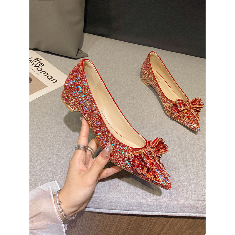 红色婚鞋女秀禾婚纱两穿2025新款高级感蝴蝶结平底新娘鞋孕妇可穿