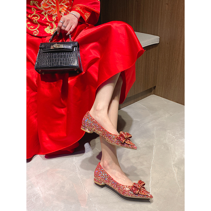 红色婚鞋秀禾婚纱两穿平底新娘鞋