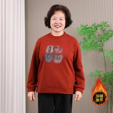 60岁胖妈妈加绒卫衣女秋冬大码宽松中老年人圆领保暖加厚上衣外套