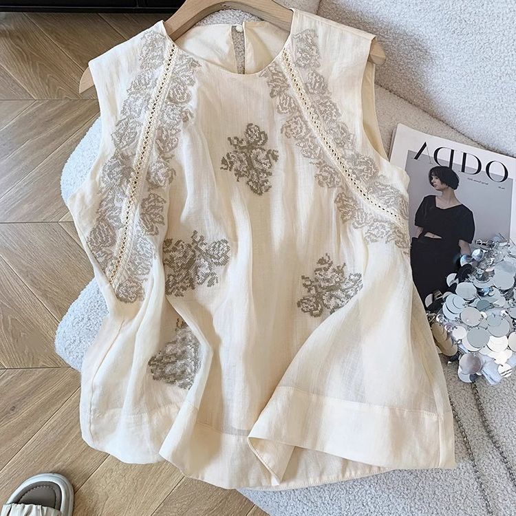 花朵刺绣亚麻无袖圆领背心女夏新款设计感小众复古慵懒气质薄上衣