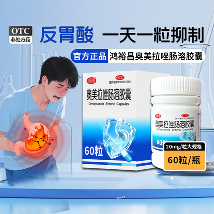 鸿裕昌奥美拉唑肠溶胶囊20mg*60粒缓解胃酸过多引起反酸烧心症状