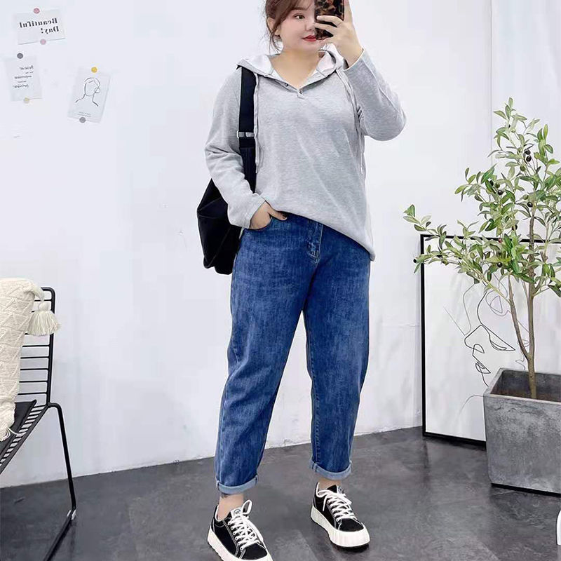 胖妹妹高腰牛仔裤子女宽松大码老爹九分哈伦裤春秋胖mm显瘦百搭裤