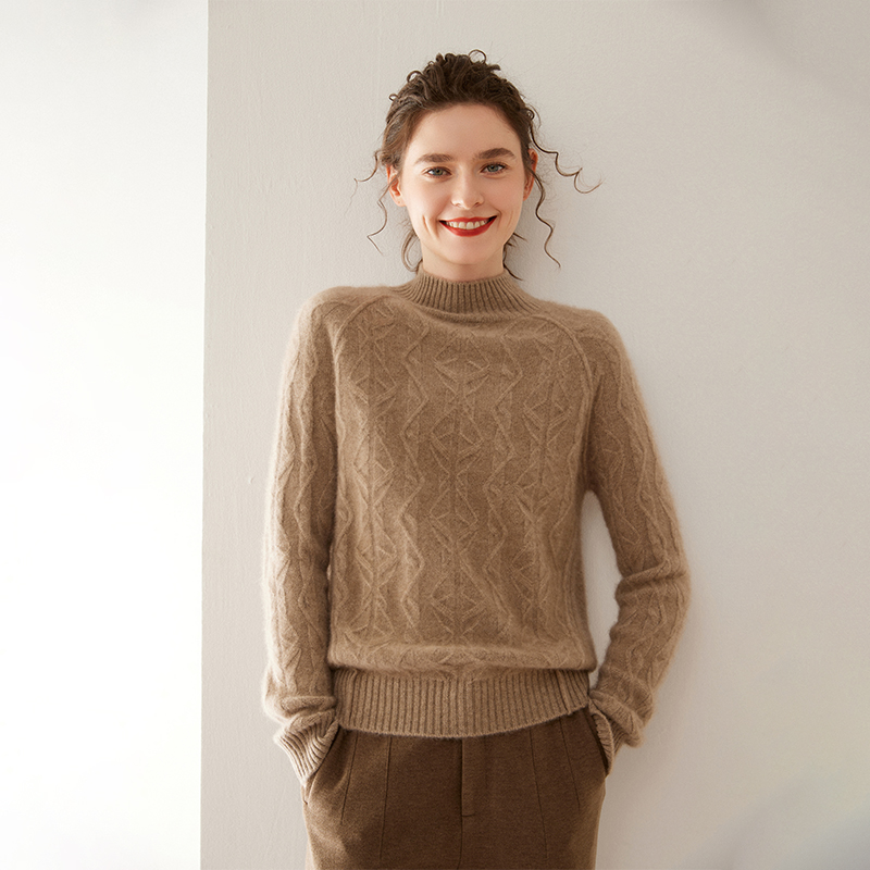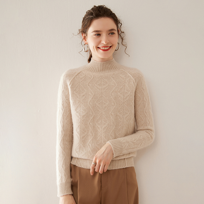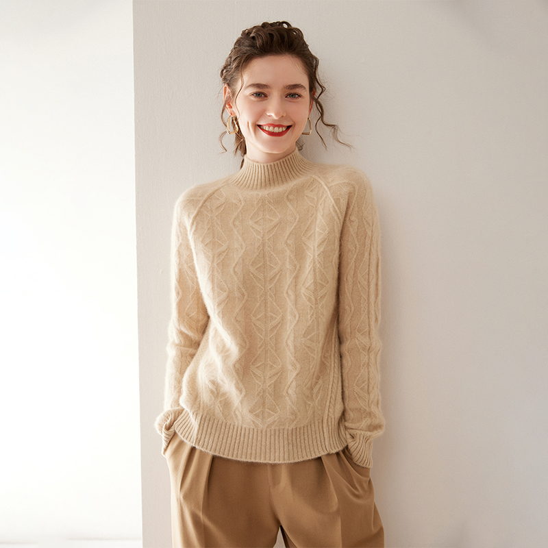 2024秋冬新款羊绒衫女半高领山羊绒套头绞花加厚宽松纯色针织毛衣