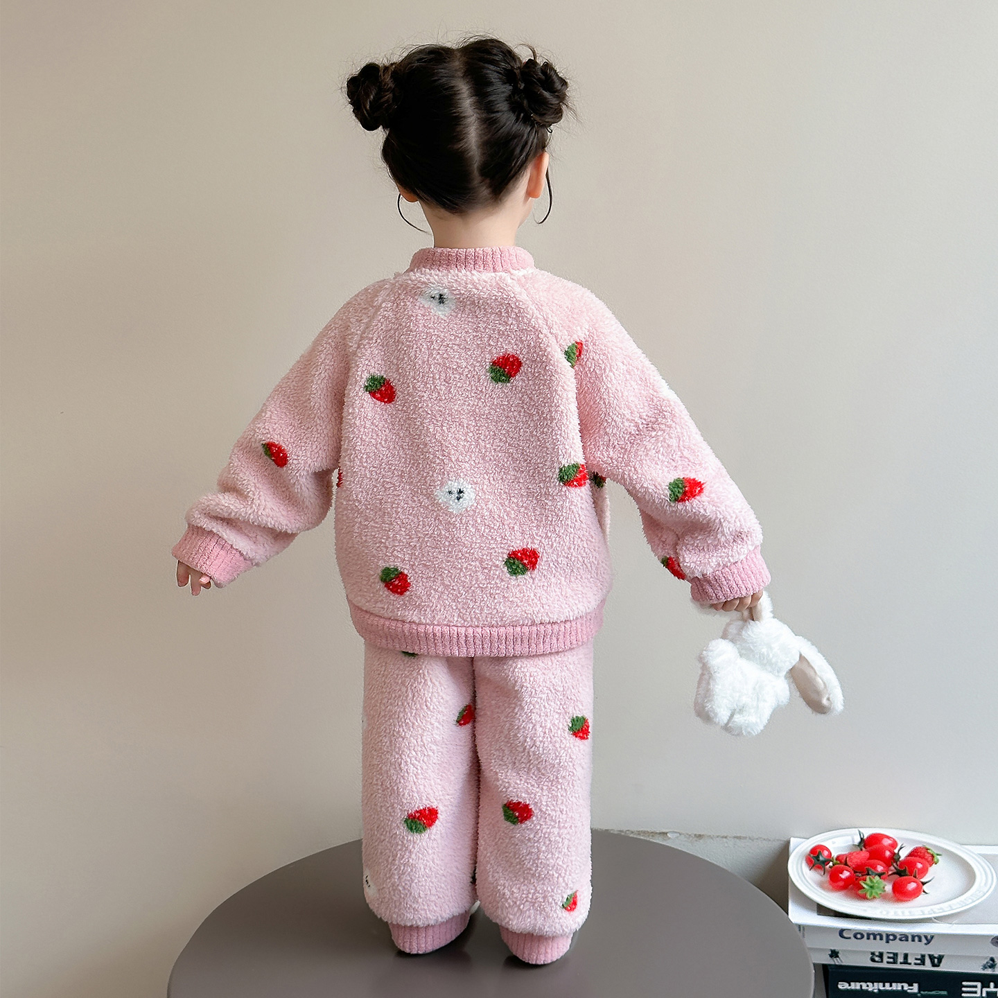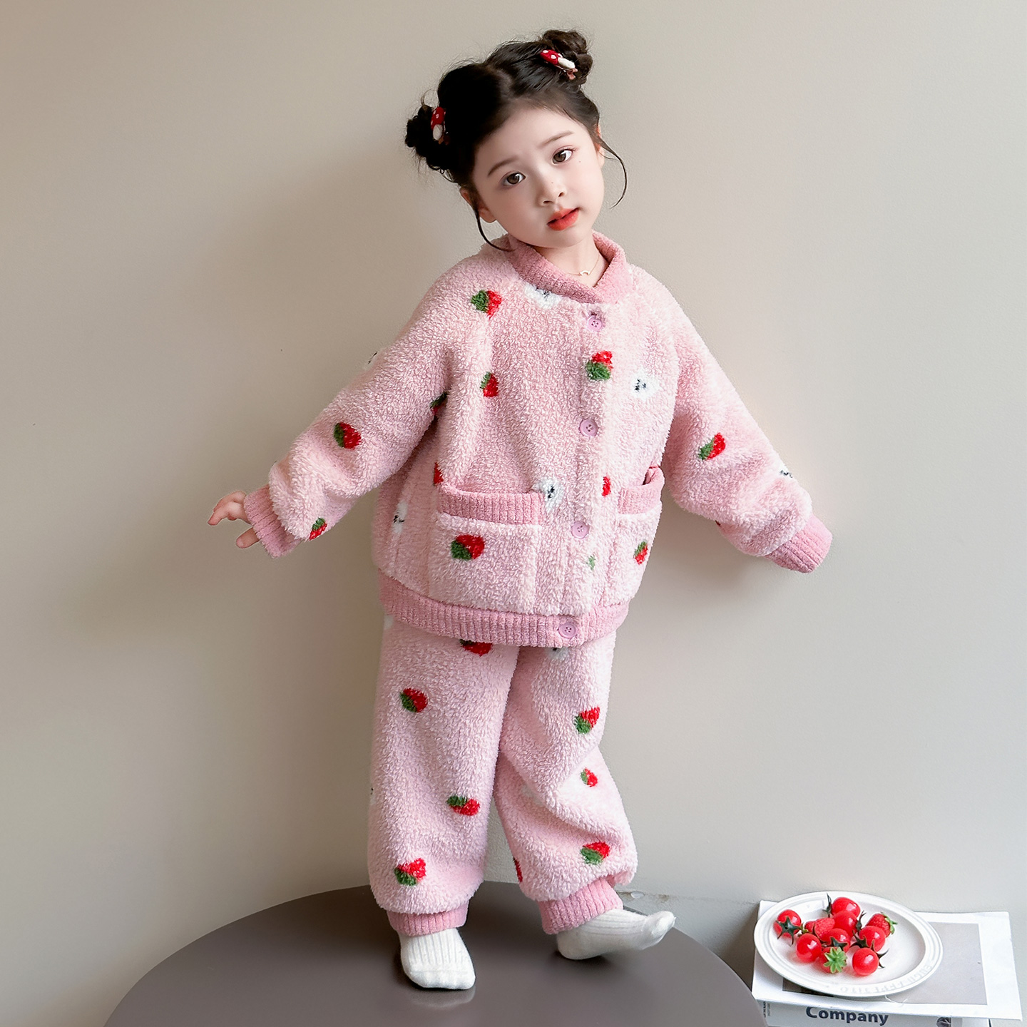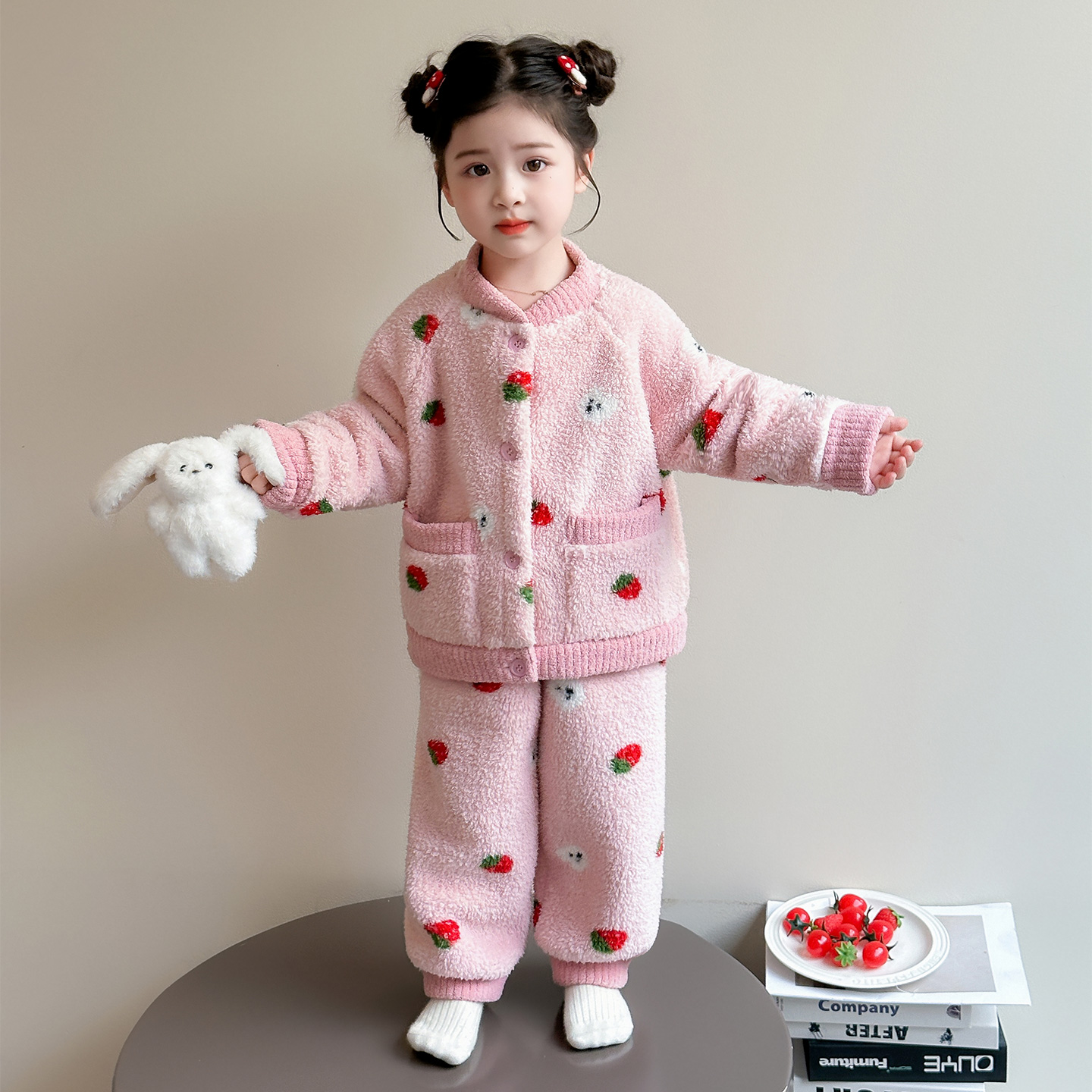 儿童睡衣女童秋冬款2025新款珊瑚绒宝宝卡通草莓家居服套装可外穿