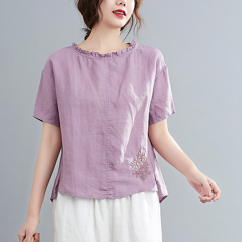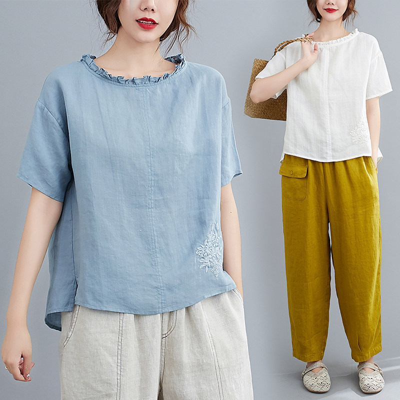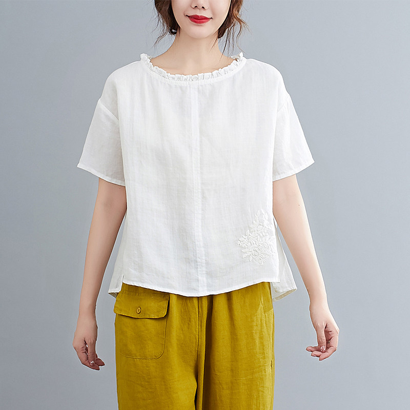 夏季新款复古甜美花边领刺绣棉麻T百搭短袖宽松大码上衣T恤女套头