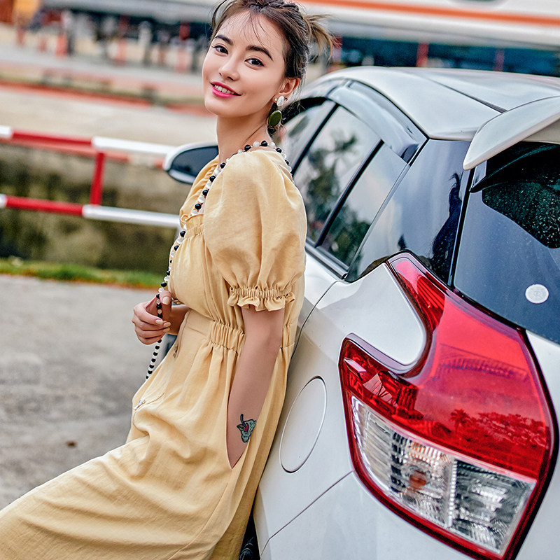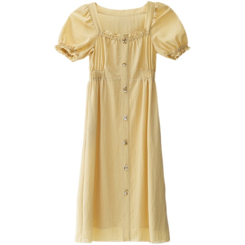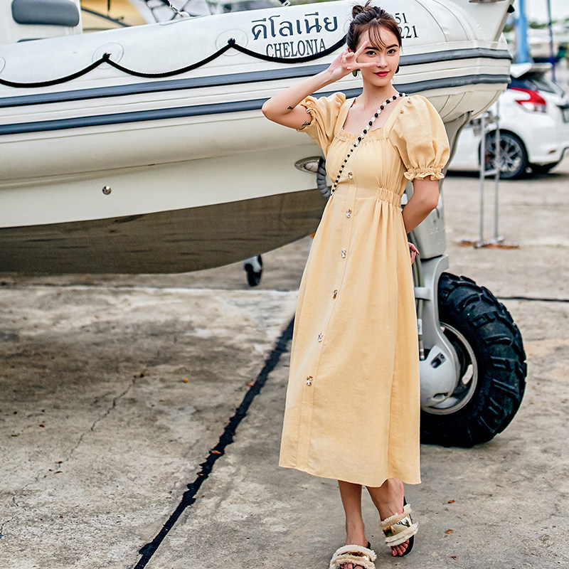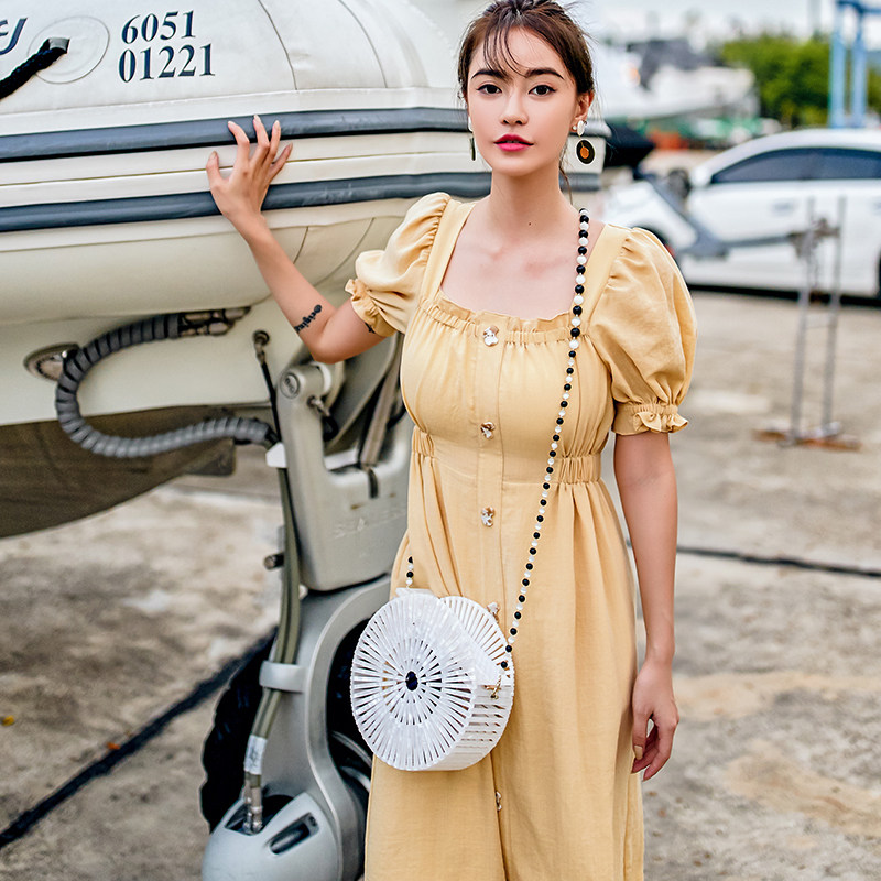 vimi原创方领裙2021夏季新品通勤收腰显瘦连衣裙性感修身纯色长裙