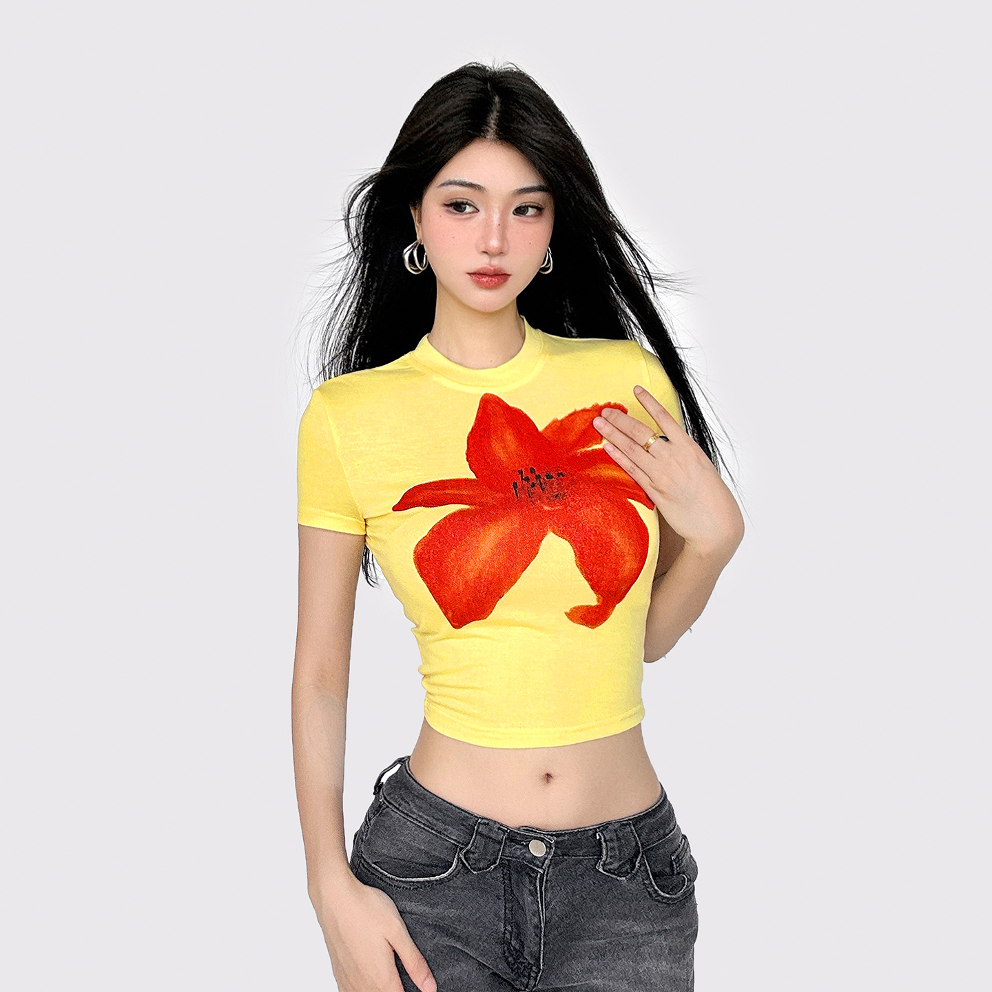 FUNOFF 美式街头黄色花卉印花短袖T恤夏度假风撞色露脐收腰上衣女