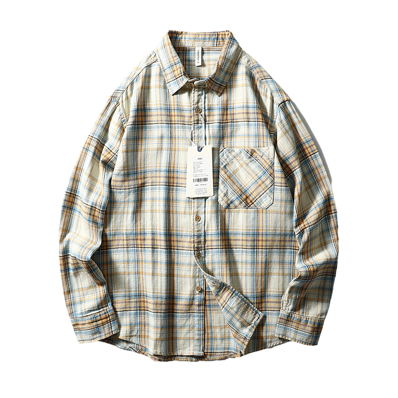 美式复古纯棉磨毛格子衬衫长袖