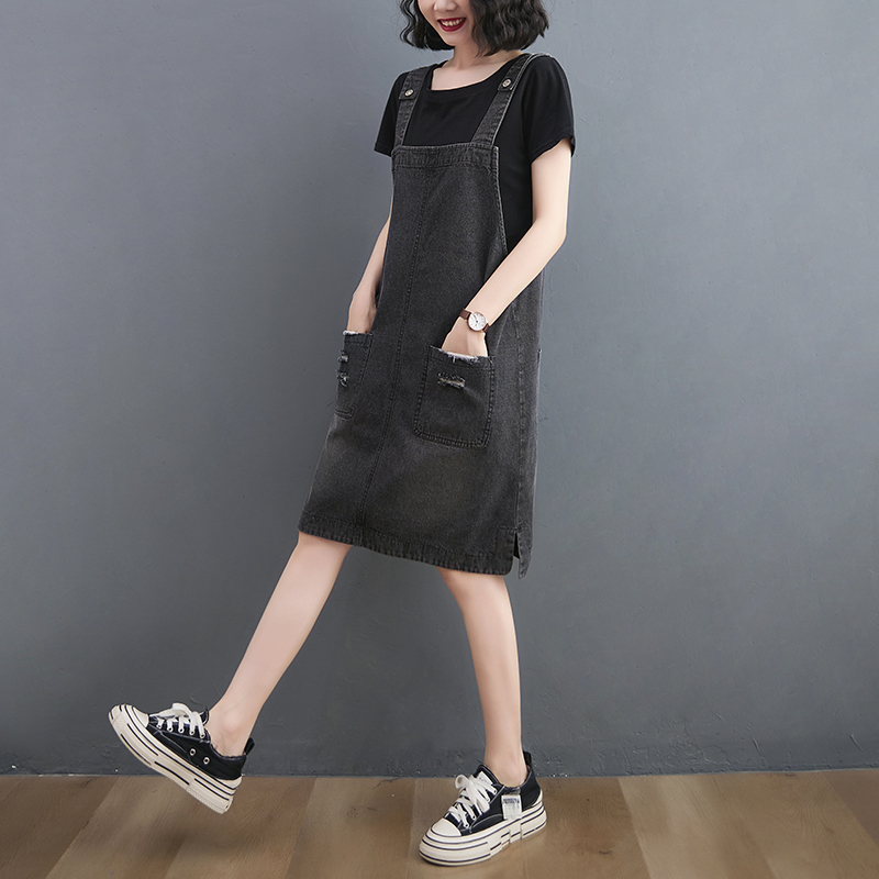破洞牛仔背带裙女夏季胖mm宽松大码显瘦减龄小个子无袖吊带连衣裙