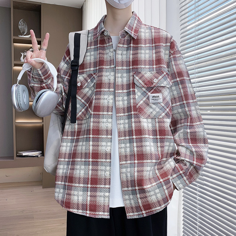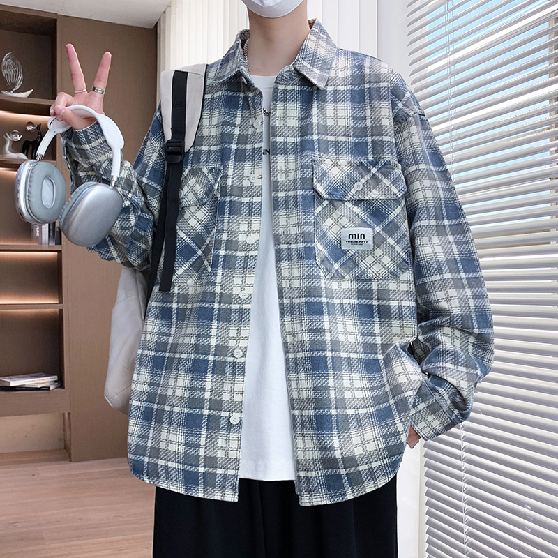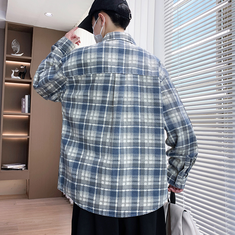 以纯衬衫式格子外套潮牌宽松夹克