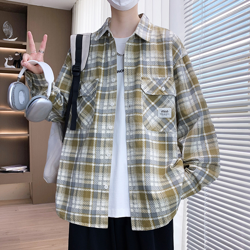 衬衫式格子外套春秋季潮牌宽松翻领夹克男款美式复古秋装褂子以純