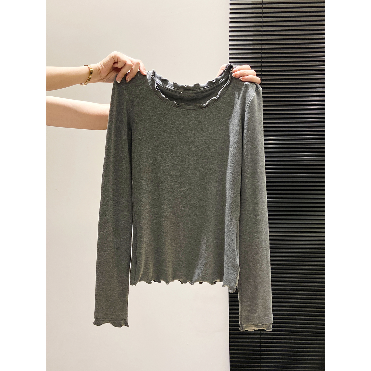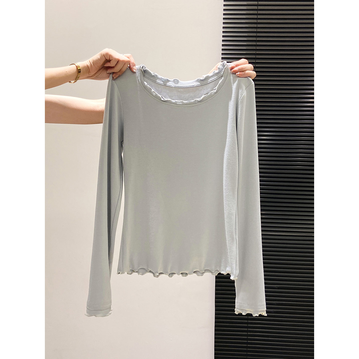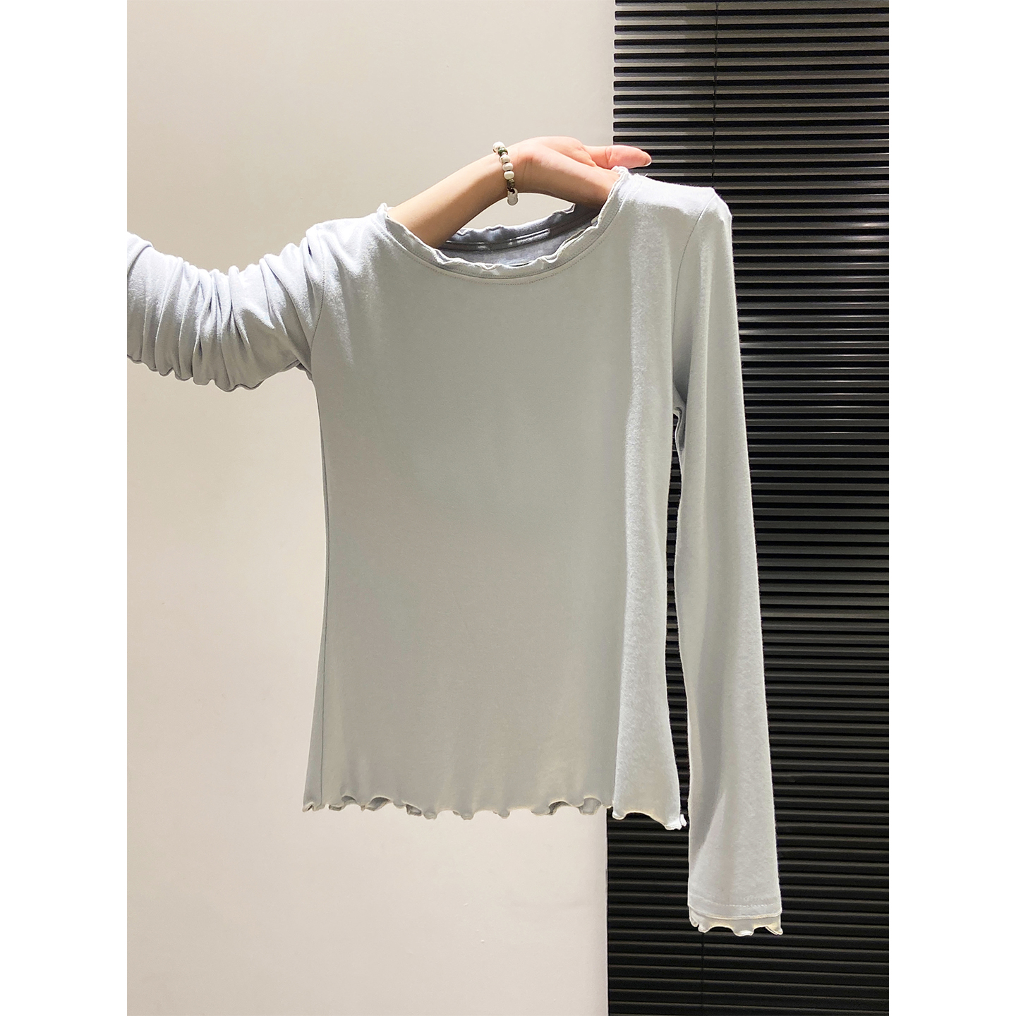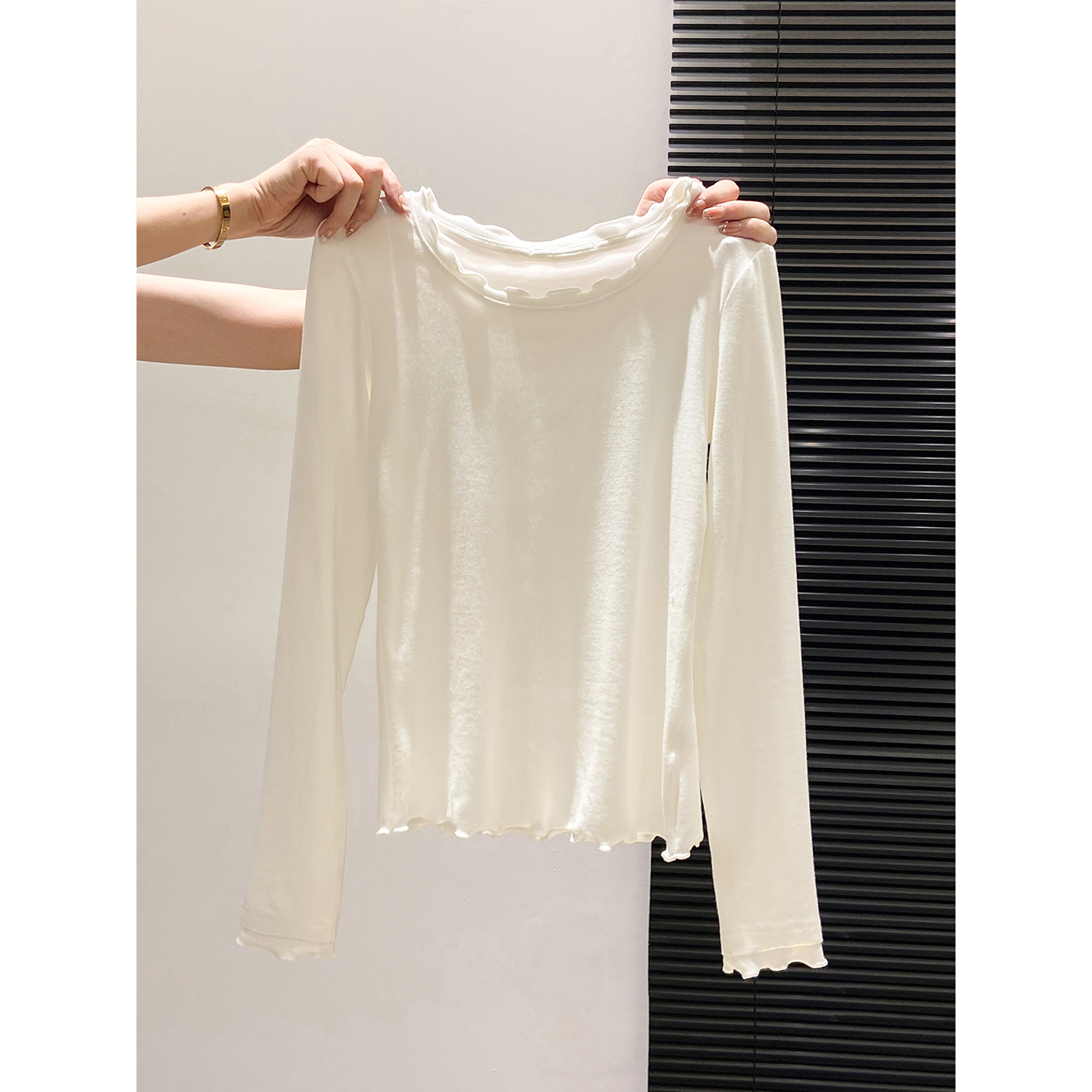 白色圆领木耳边长袖t恤女2025秋季新款修身显瘦内搭打底衫小上衣
