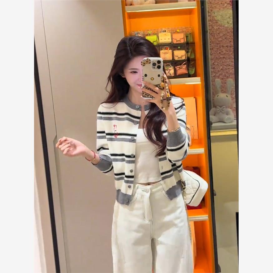 小香风条纹刺绣针织开衫外套女初秋季新款穿搭设计感毛衣修身上衣