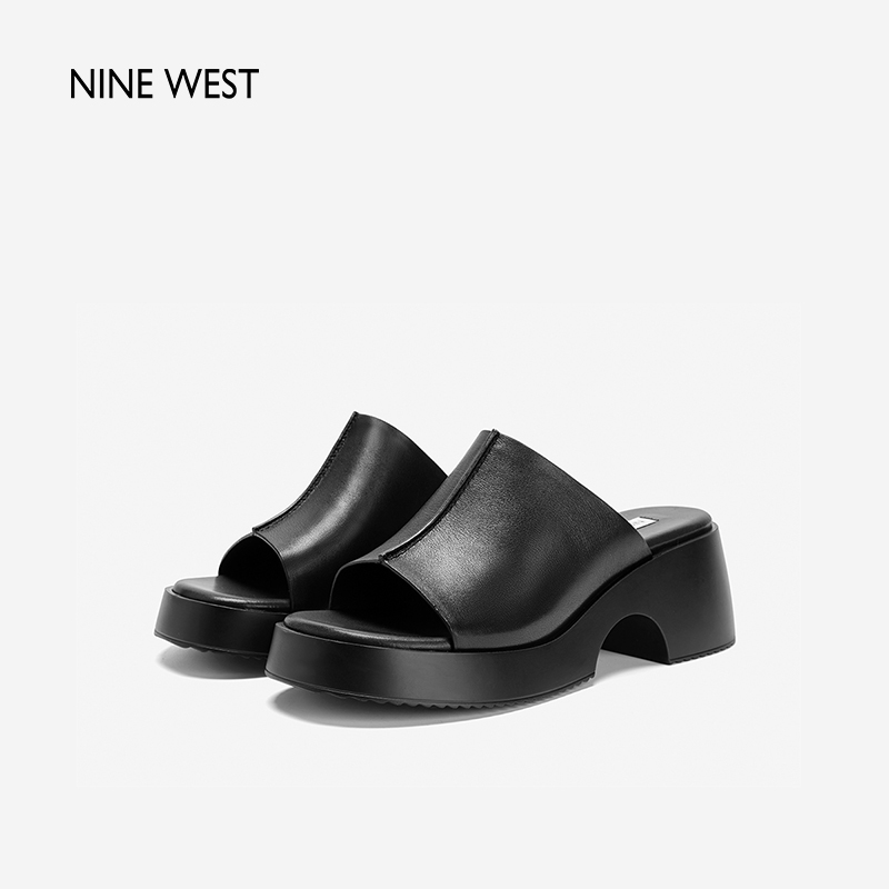 Nine West/玖熙女鞋夏季清仓粗跟厚底黑色拖鞋一字带增高凉拖鞋女