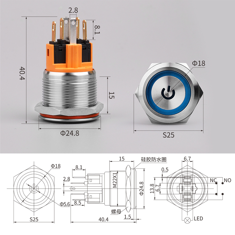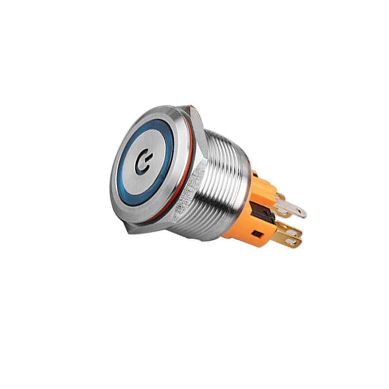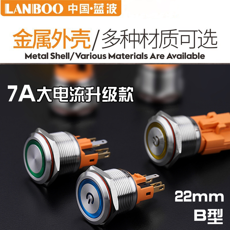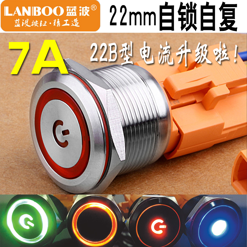 金属按钮开关不锈钢自锁自复位带灯按键防水7A大电流22mm蓝波新品