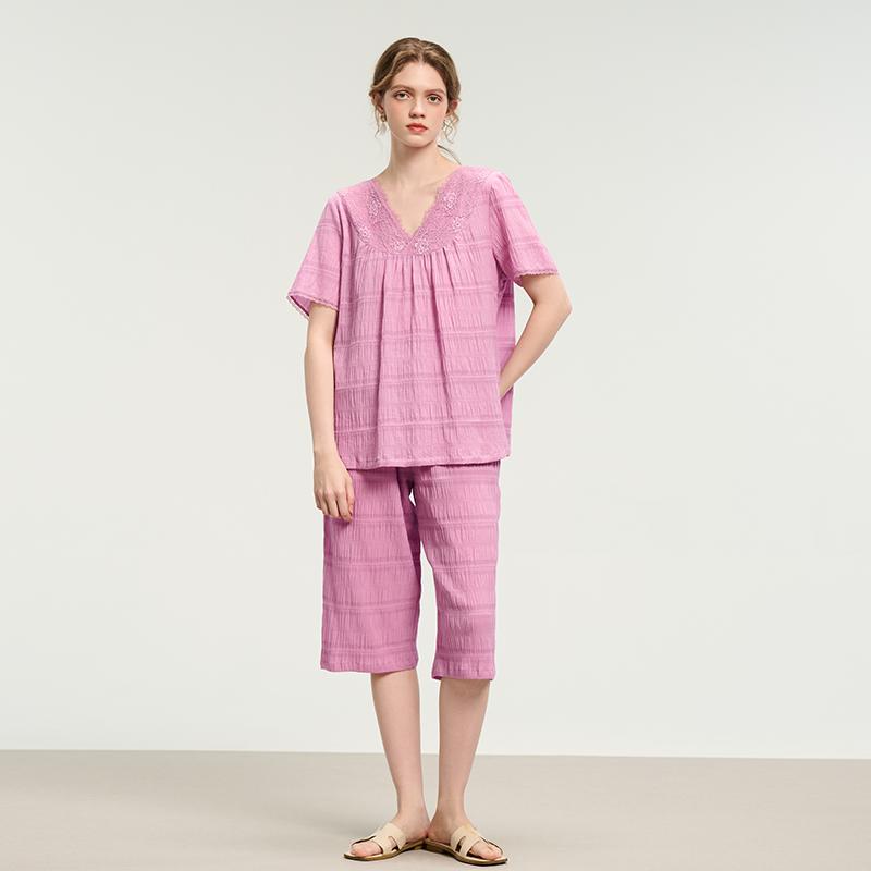 美标新款短袖七分裤纯棉睡衣女士春夏全棉梭织提花家居服两件套装
