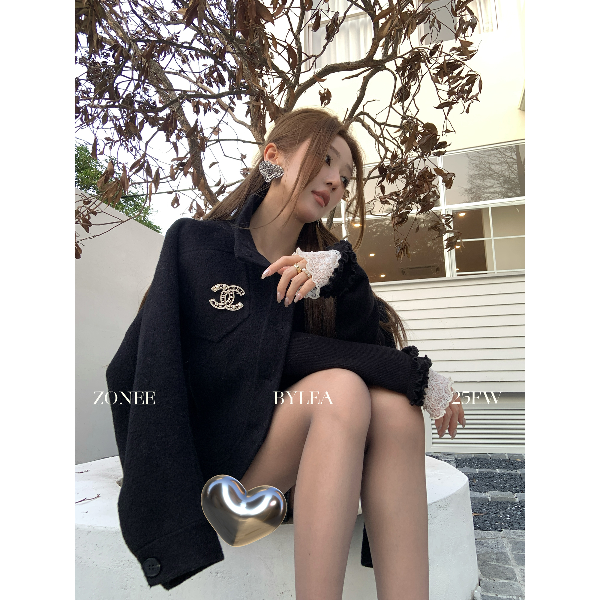 ZONEE/LEA宋亦雯 时髦黑珍珠 法式气质100羊毛短款黑色毛呢外套女