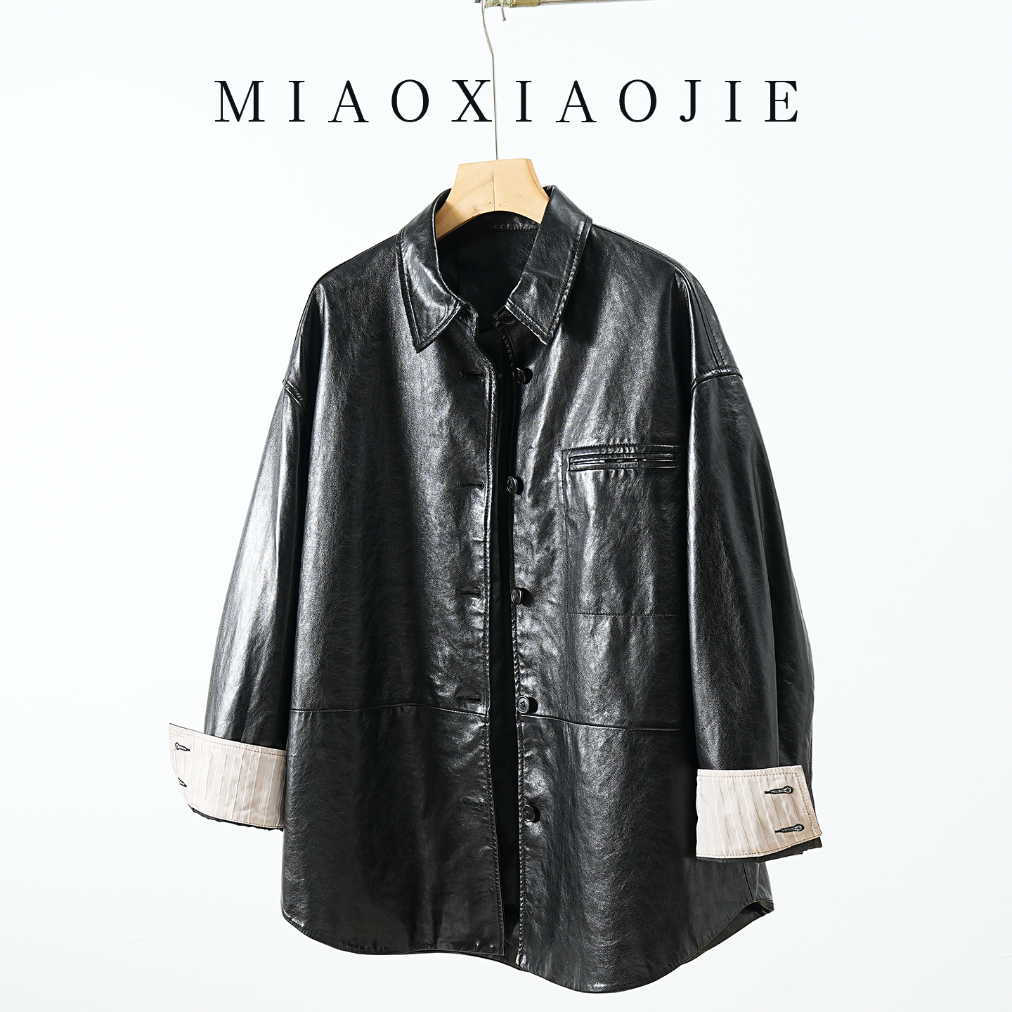 高级感油蜡小羊皮真皮皮衣皮衬衫落肩复古松弛老钱风中长款外套女