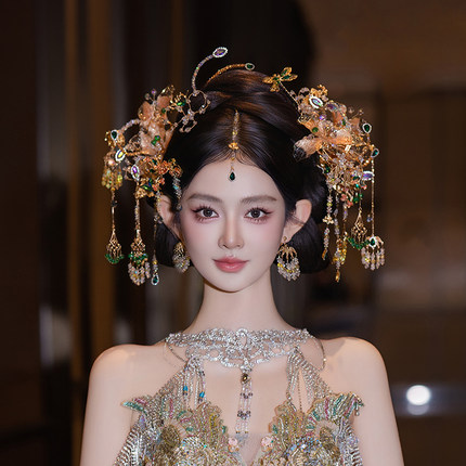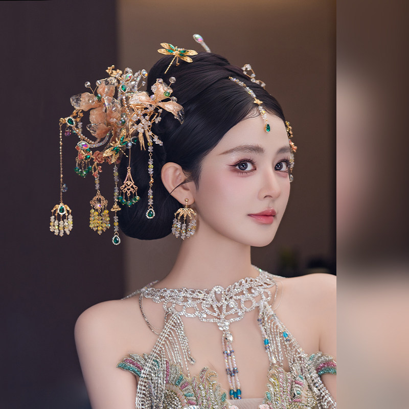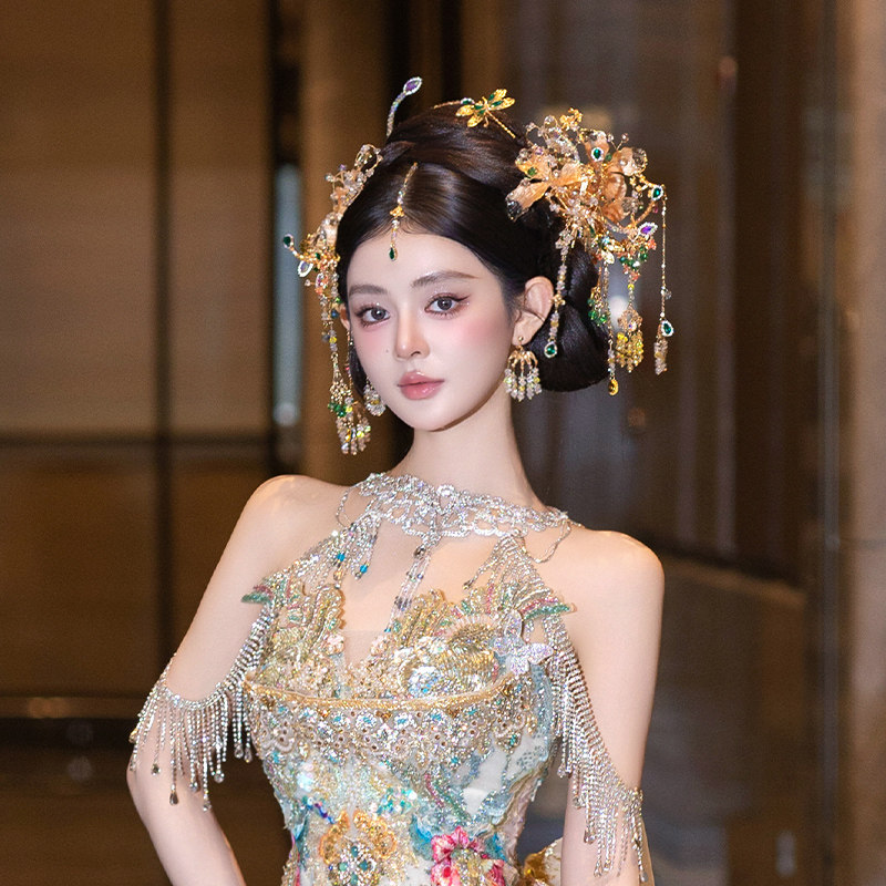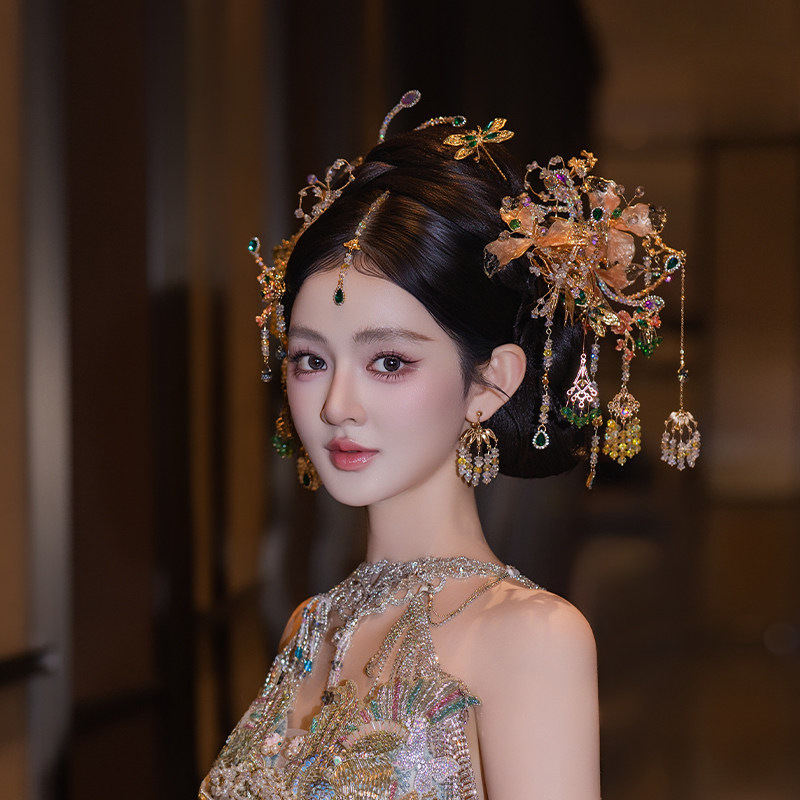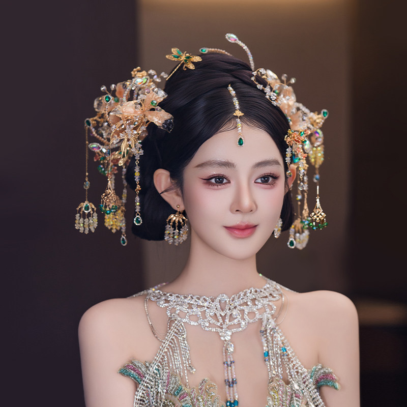 新款新娘中式婚礼香槟色秀禾头饰精致小众眉心坠汉服礼服气质发饰