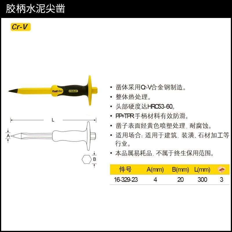 史丹利工具胶柄石工凿水泥尖凿子石头凿水泥凿錾子冲凿16-329-23