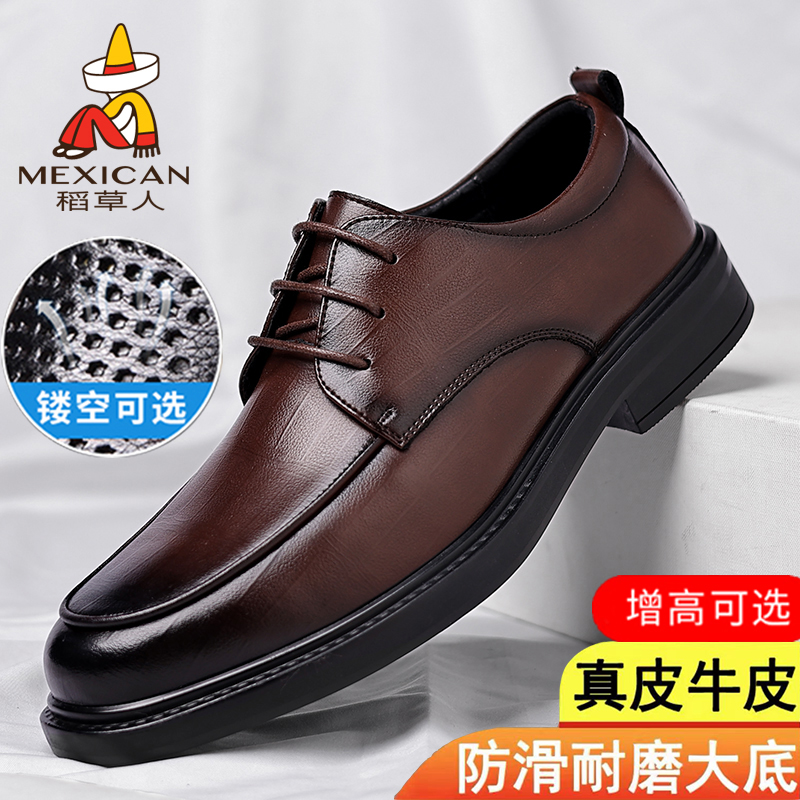 稻草人皮鞋男款秋季真皮高端透气增高镂空英伦正装商务休闲鞋子男