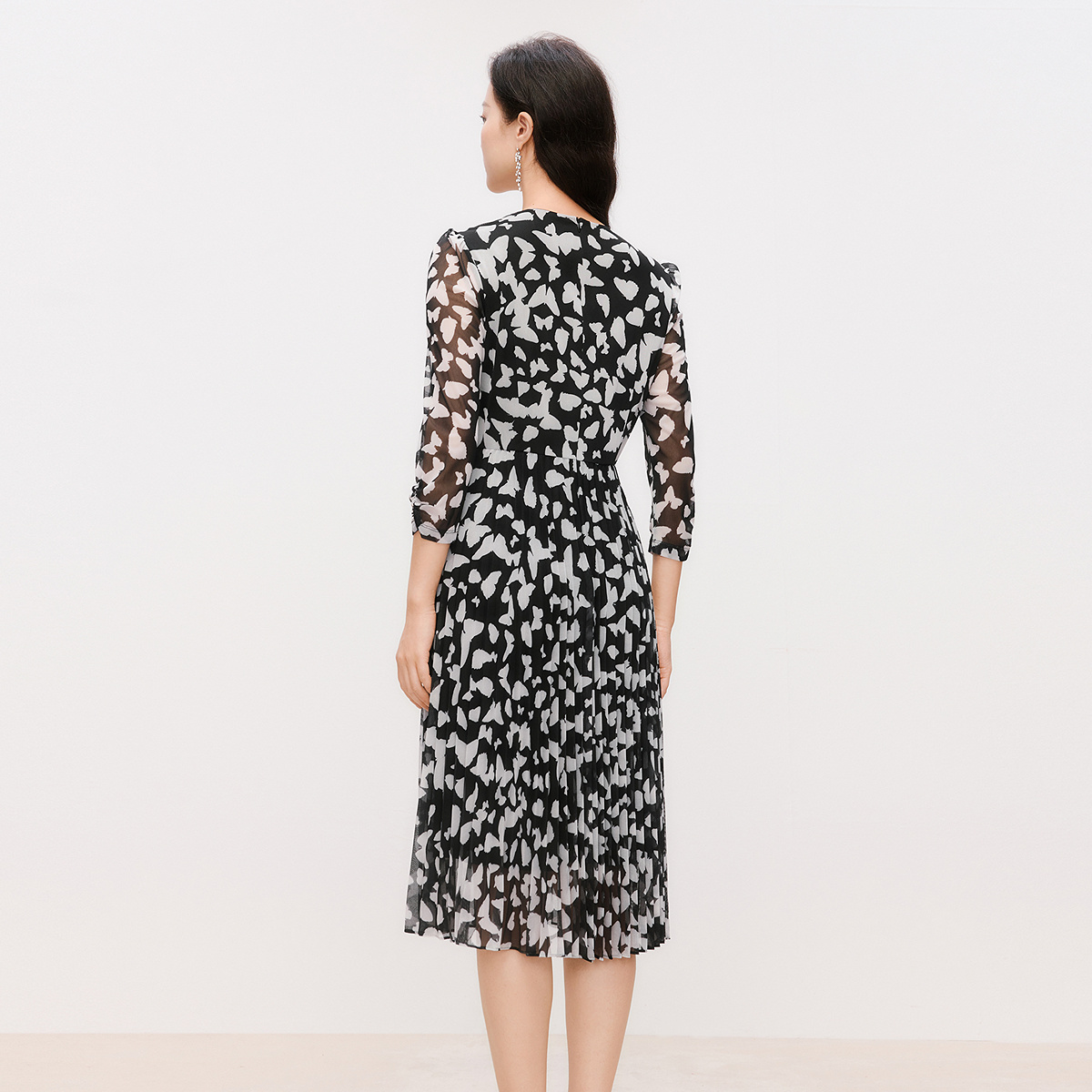 珂莱蒂尔夏V领收腰连衣裙女优雅修身七分袖中长裙碎花裙