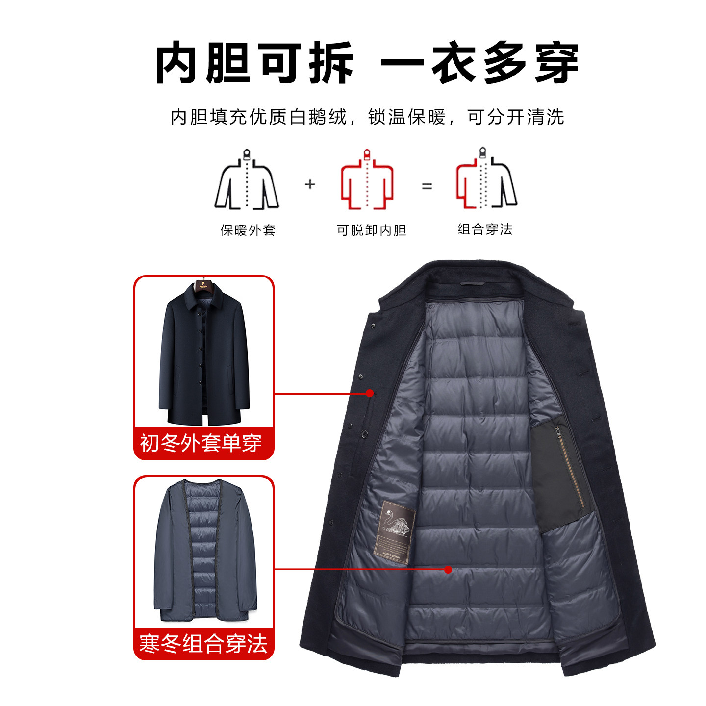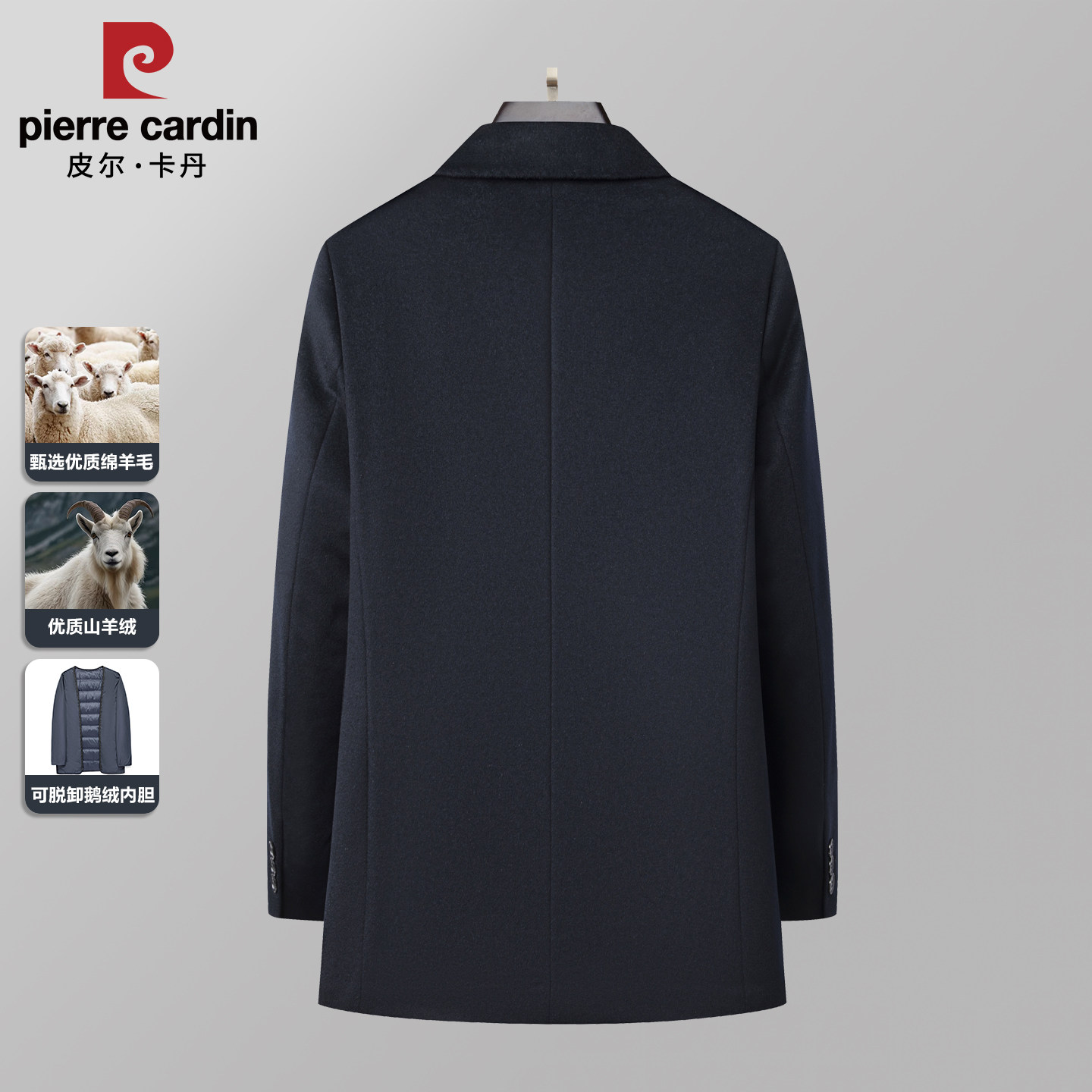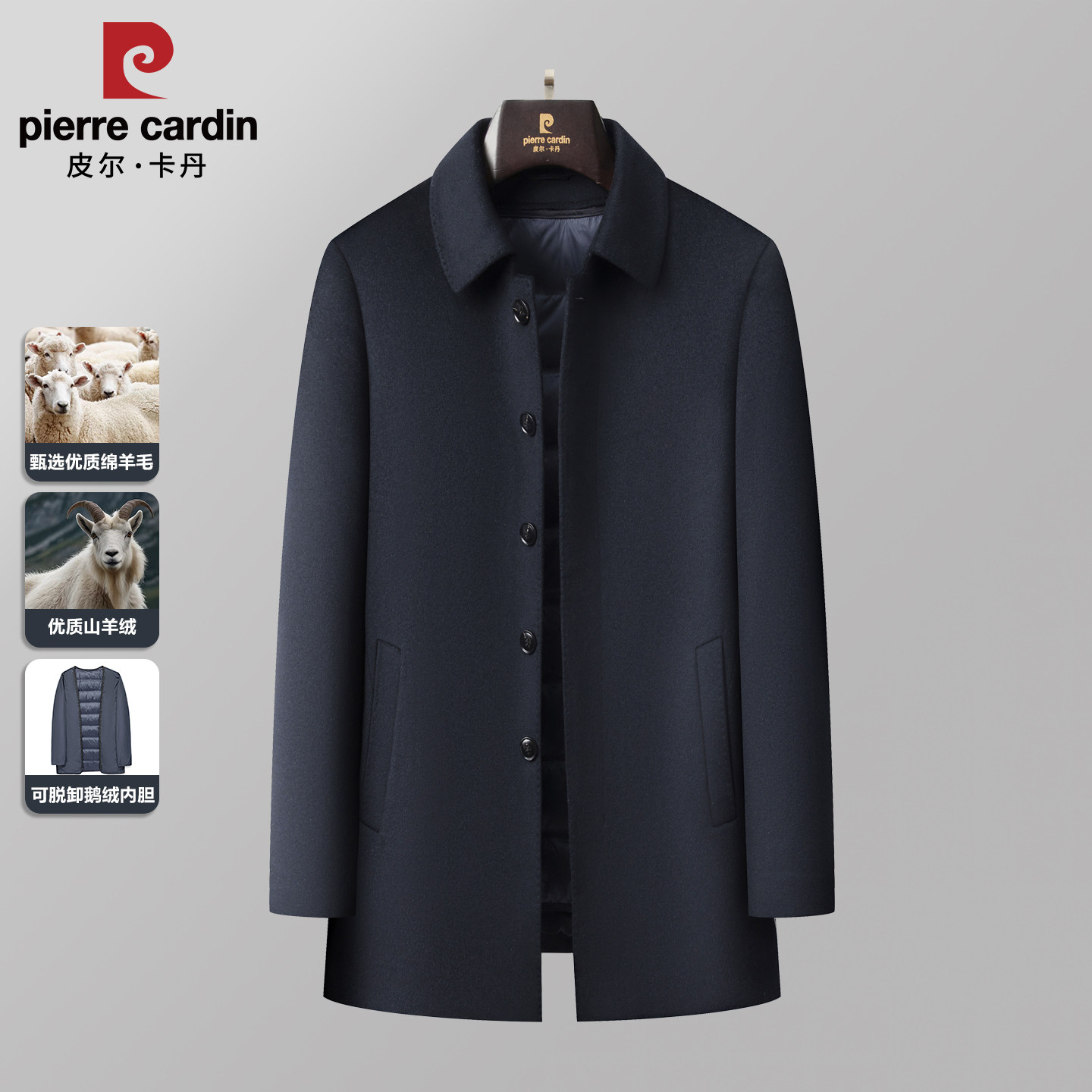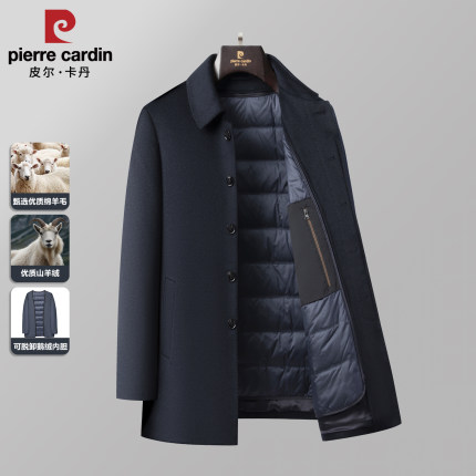 皮尔卡丹羊绒翻领商务行政中长款外套男鹅绒内胆羊毛大衣爸爸毛呢