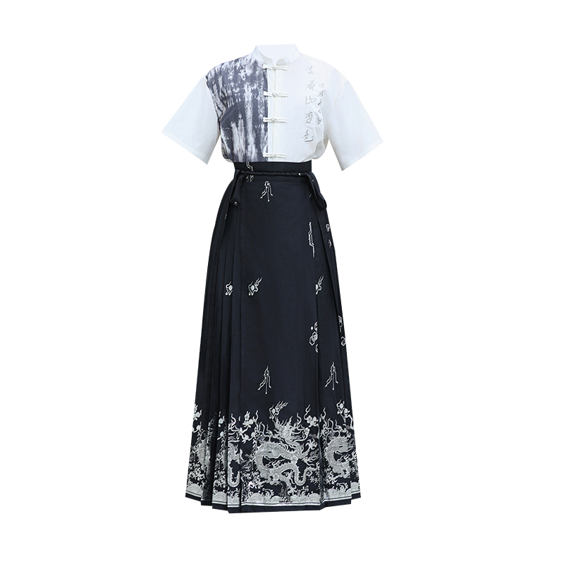 原创实拍夏新中式立领国风刺绣短袖盘扣上衣衬衫烫金马面裙汉服