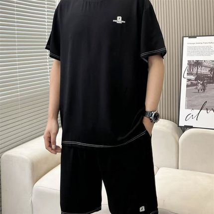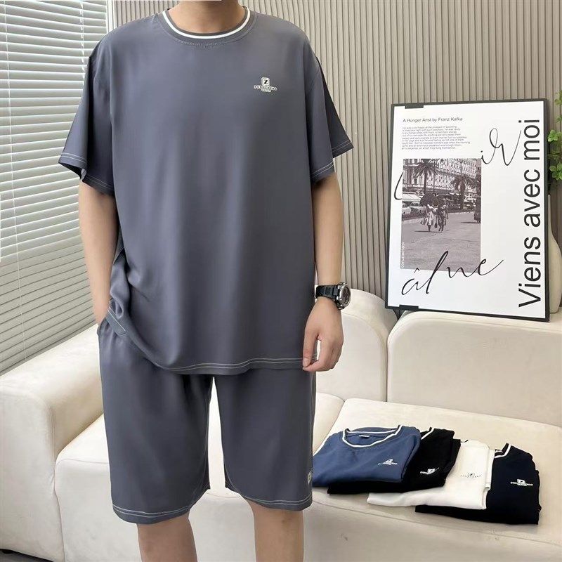 棉绸套装男士夏季爸爸薄款大码休闲短裤中老年外穿短袖人造棉套装