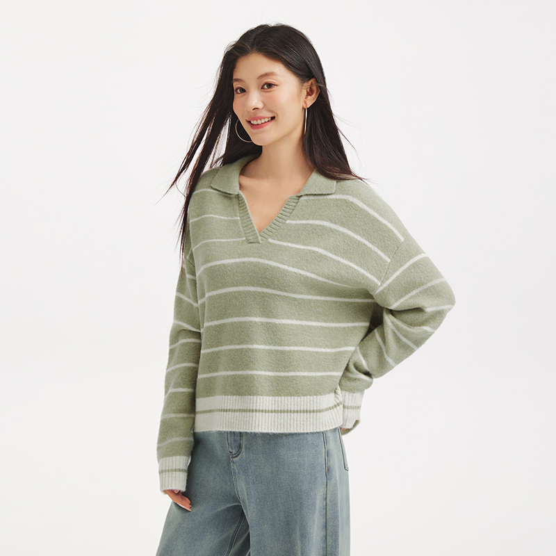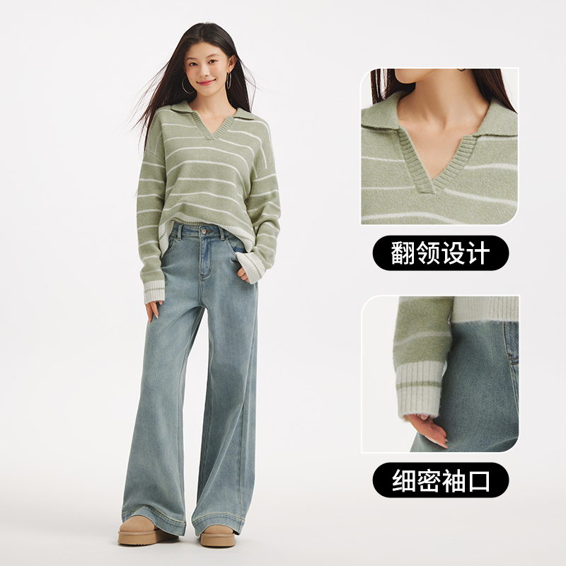 热风女士针织衫2025年冬季新款V领条纹上衣翻领宽松慵懒风打底衫