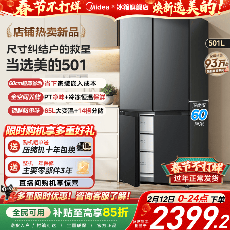 美的501十字双开四门大容量家用电冰箱超薄一级能效嵌入风冷无霜