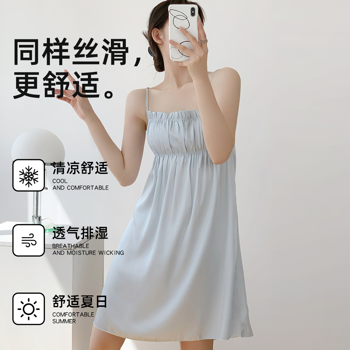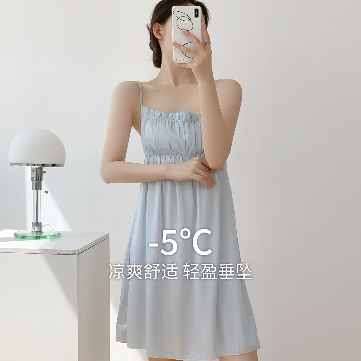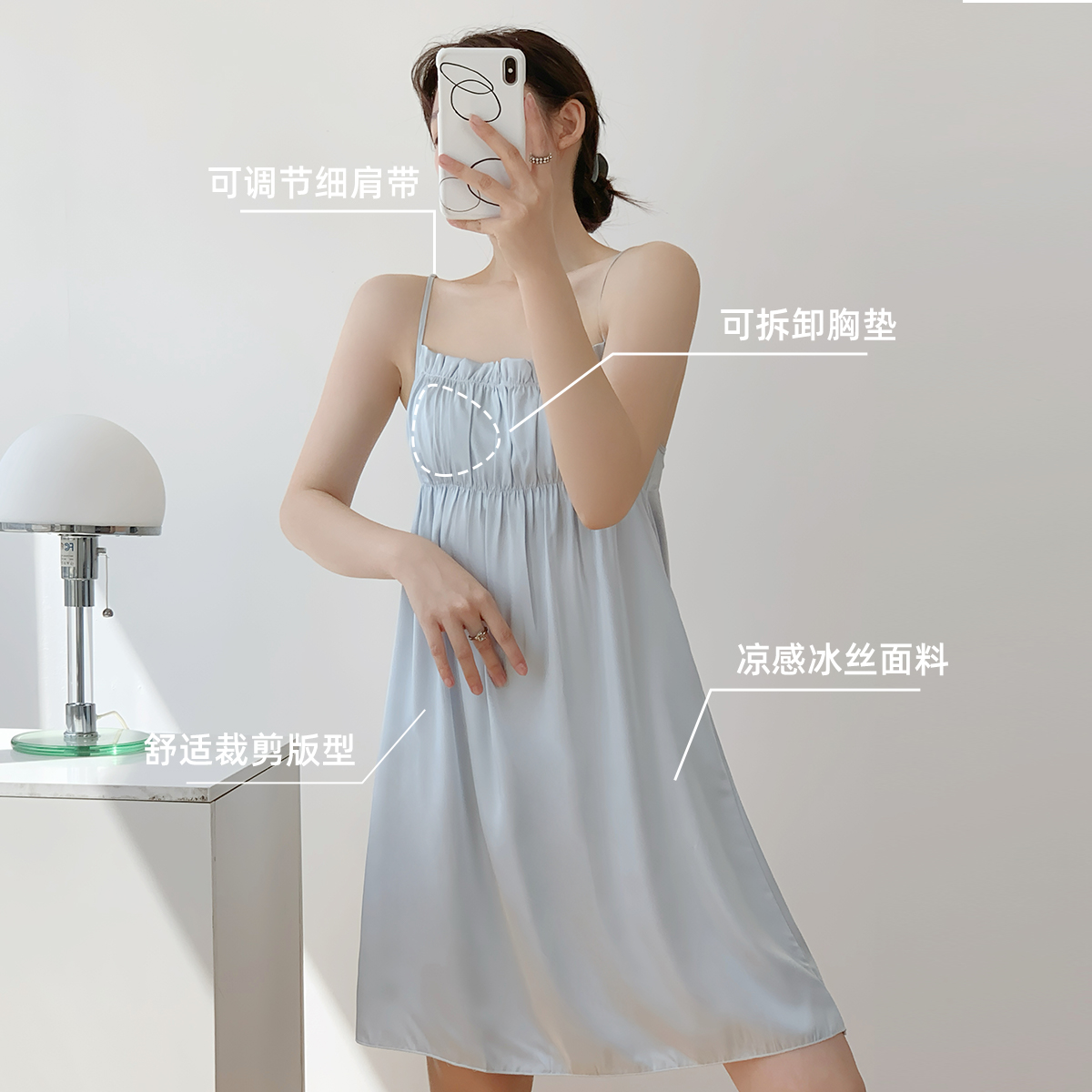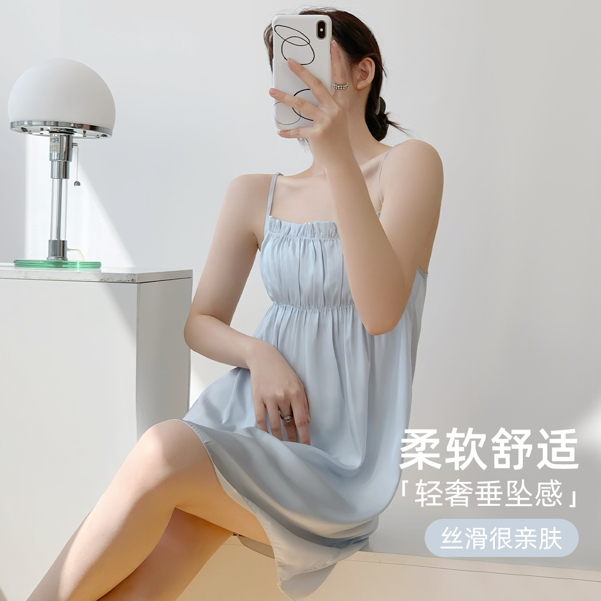 乐姿梦冰丝睡裙慕斯蓝吊带睡衣女夏季性感纯欲风带胸垫2025新款夏