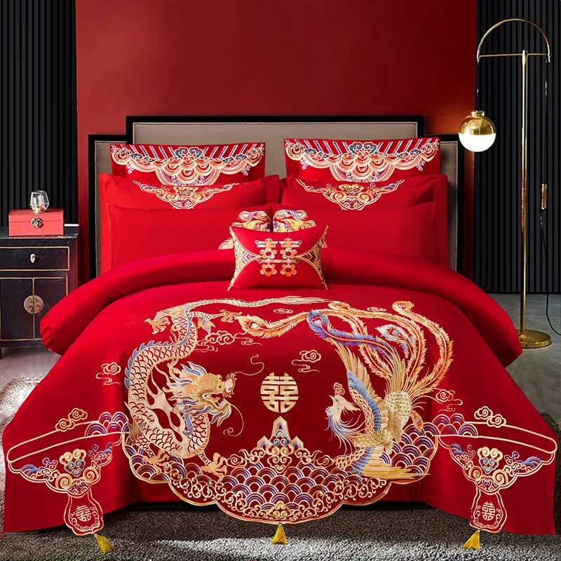 新婚庆四件套刺绣大红色喜被结婚房龙凤嫁礼六八件套纯棉床上用品