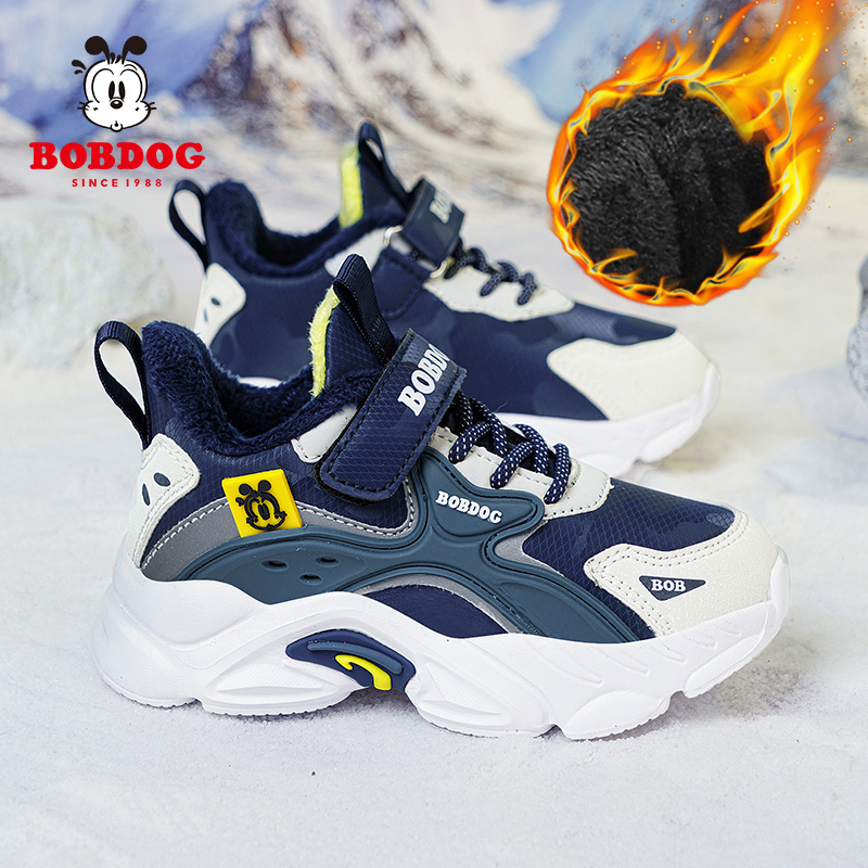 巴布豆儿童运动鞋冬季新款加绒二棉中大童皮面防水保暖男童跑步鞋