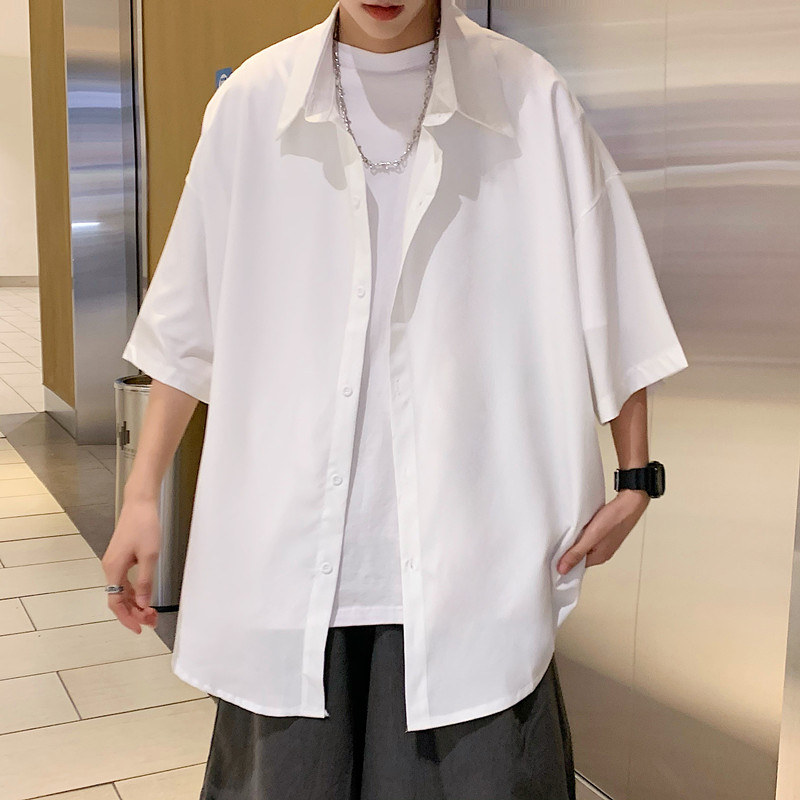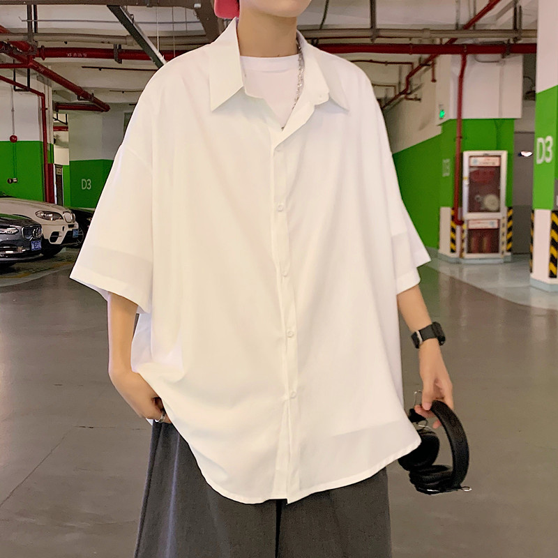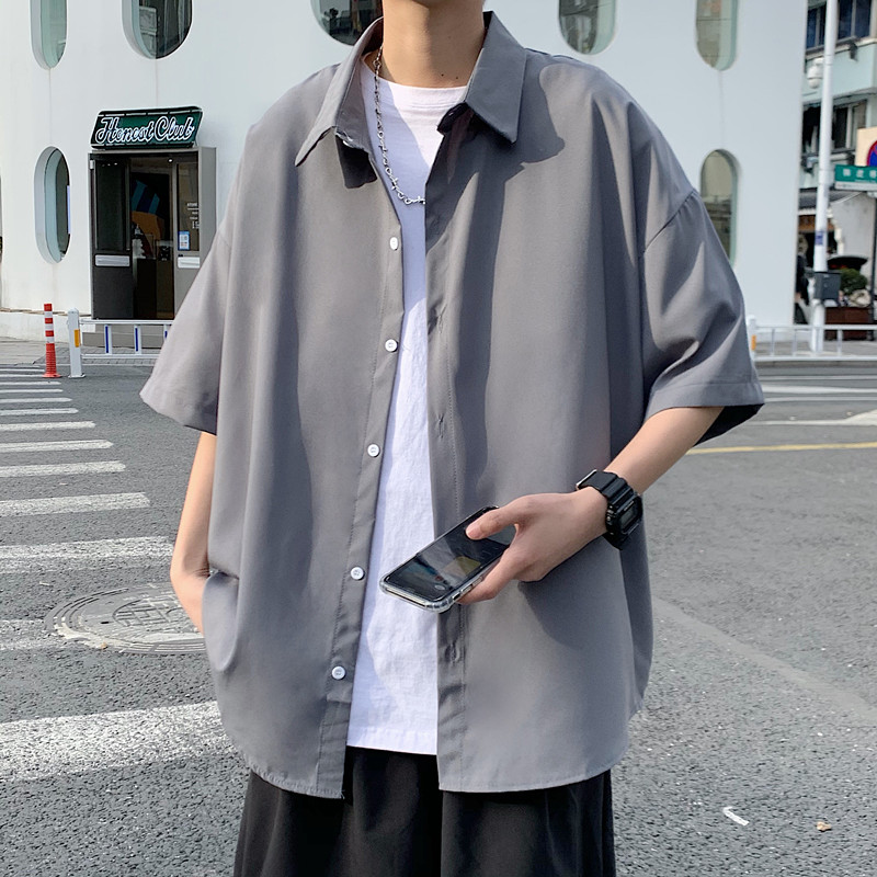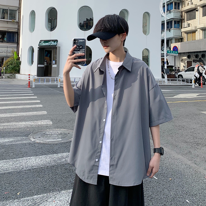 原宿风小众短袖衬衫男女宽松简约垂感五分袖衬衣夏季薄款休闲外套
