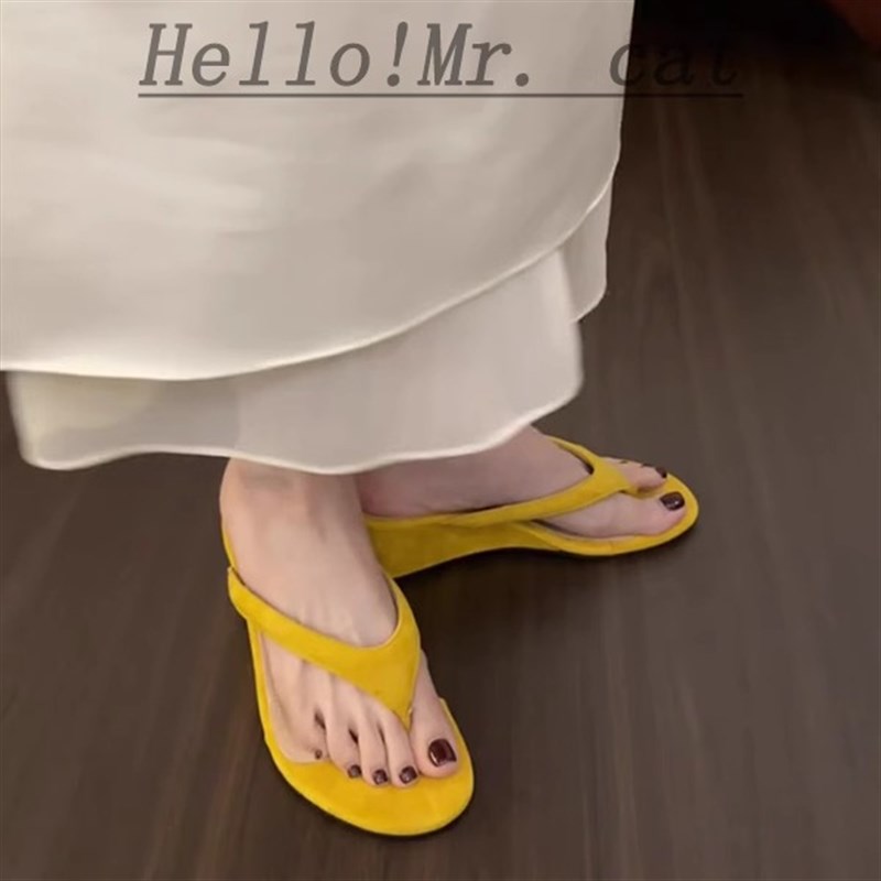 黄色坡跟人字拖夹脚拖鞋女鞋外穿高跟凉拖鞋沙滩凉鞋海边度假休闲