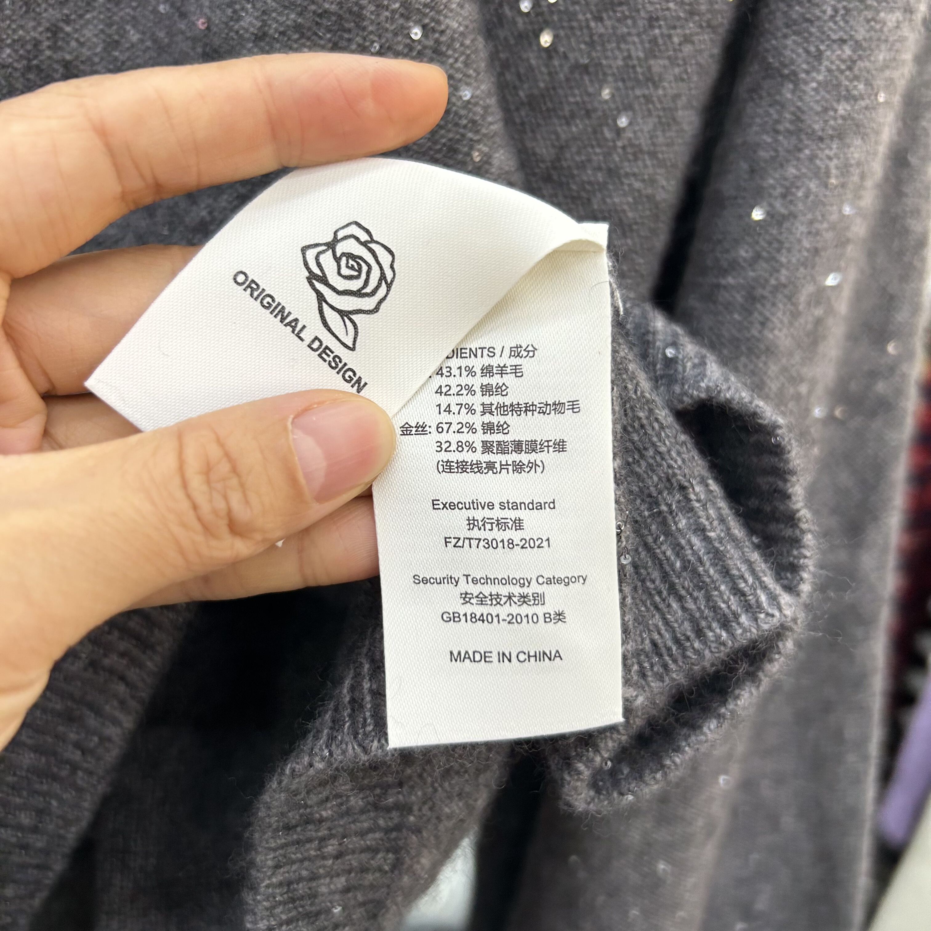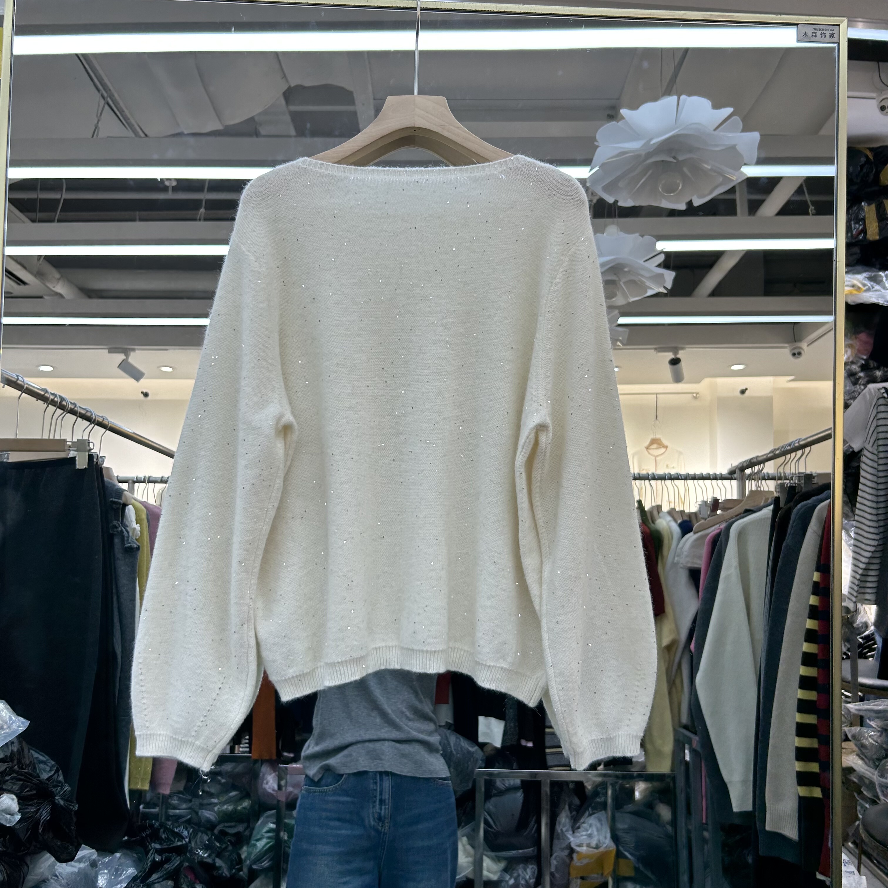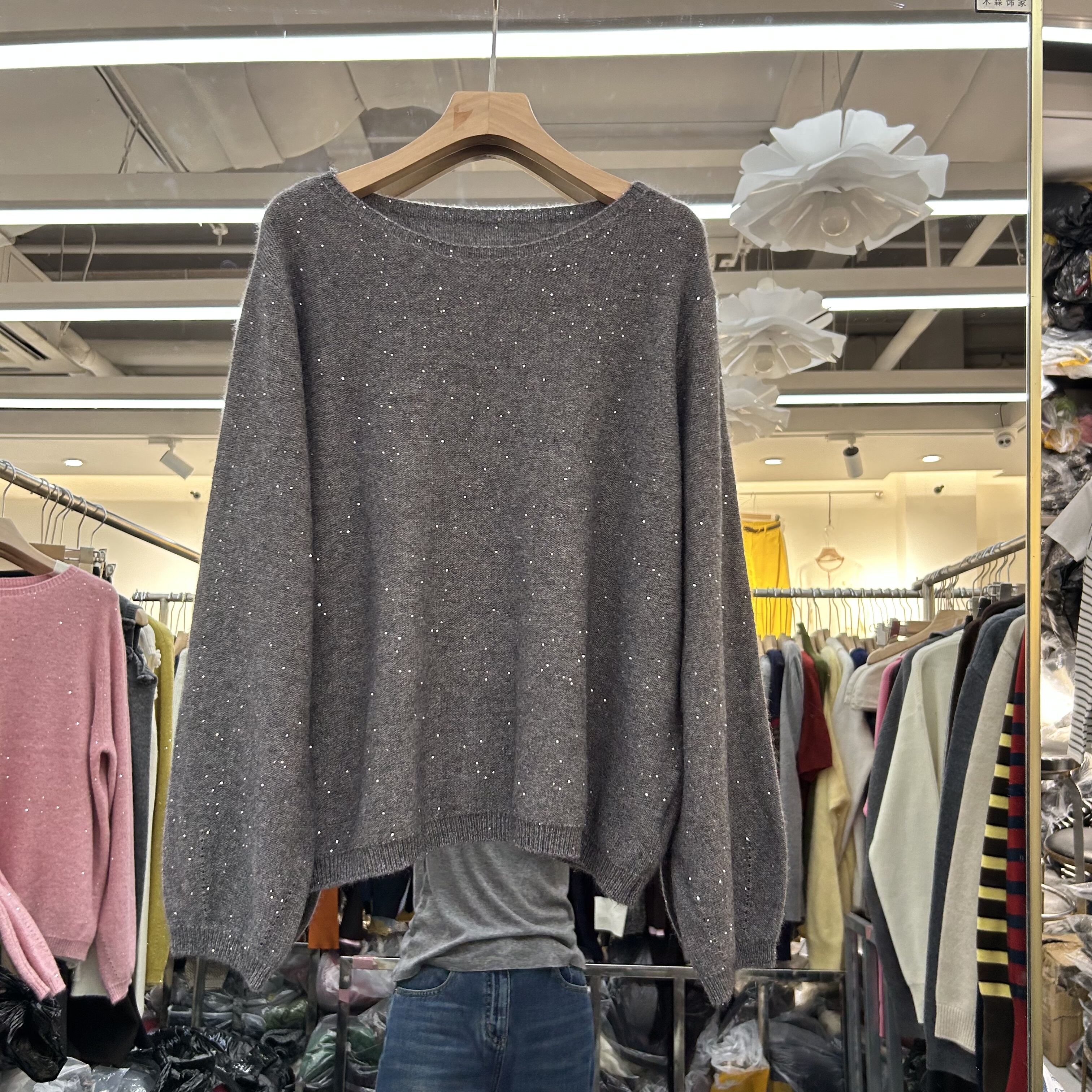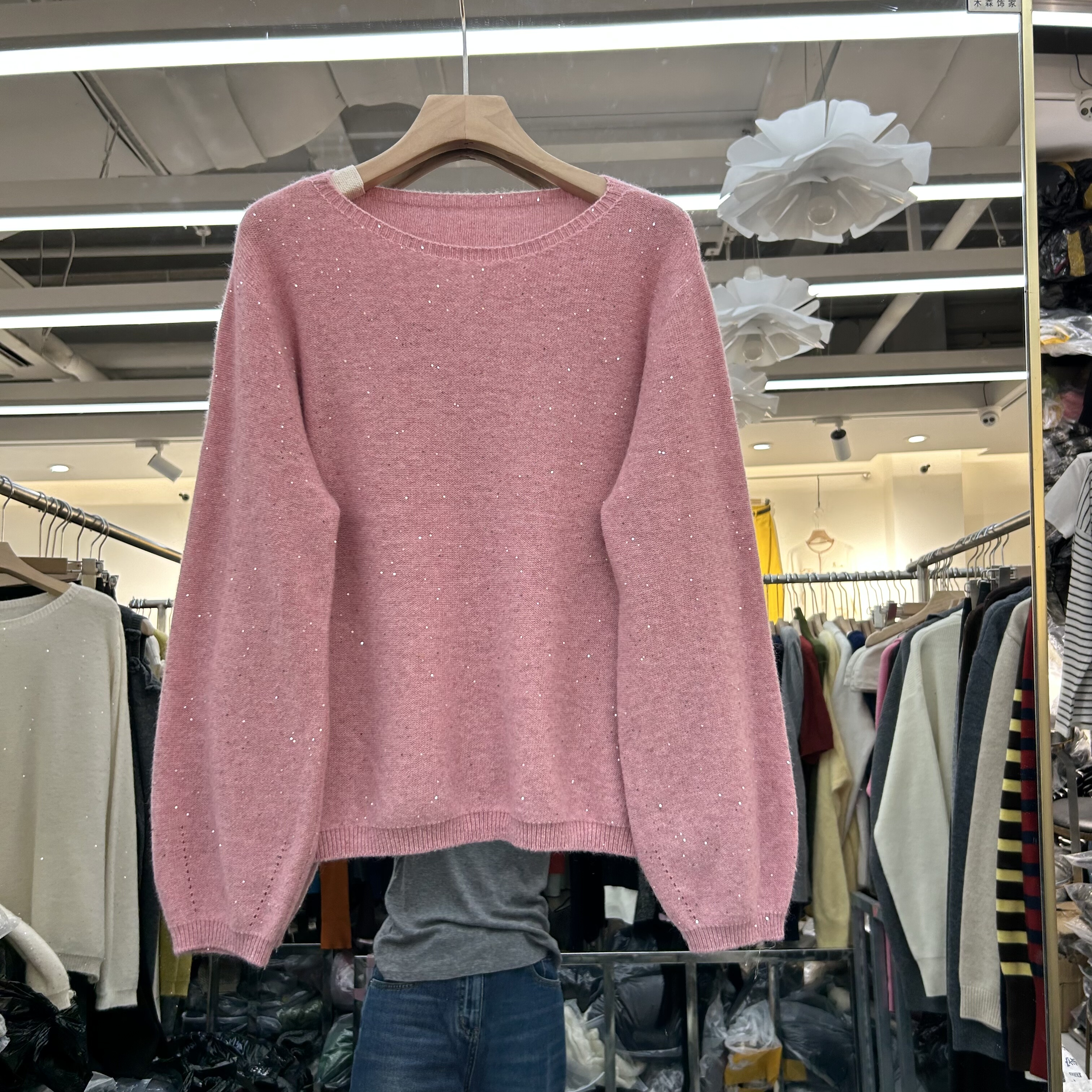 欧洲站2025秋季新款女士圆领亮片纯色羊驼毛长袖毛衣欧货宽松针织