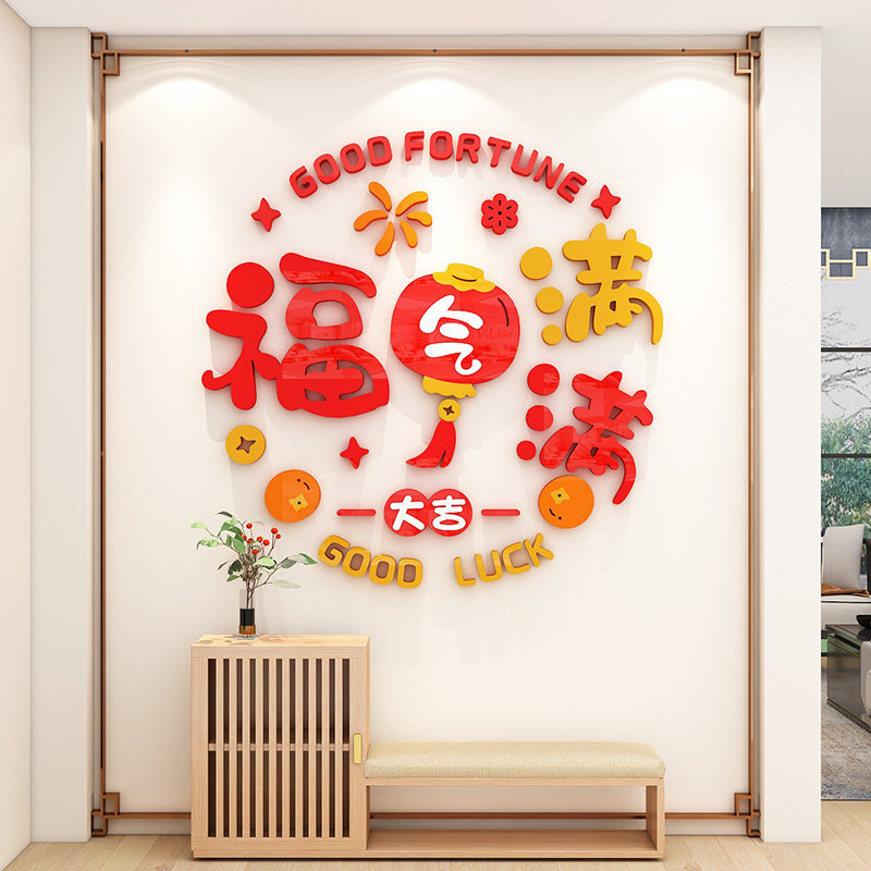 新年装饰餐客厅电视背景墙面布置过年春节入户玄关房间福字墙贴3d