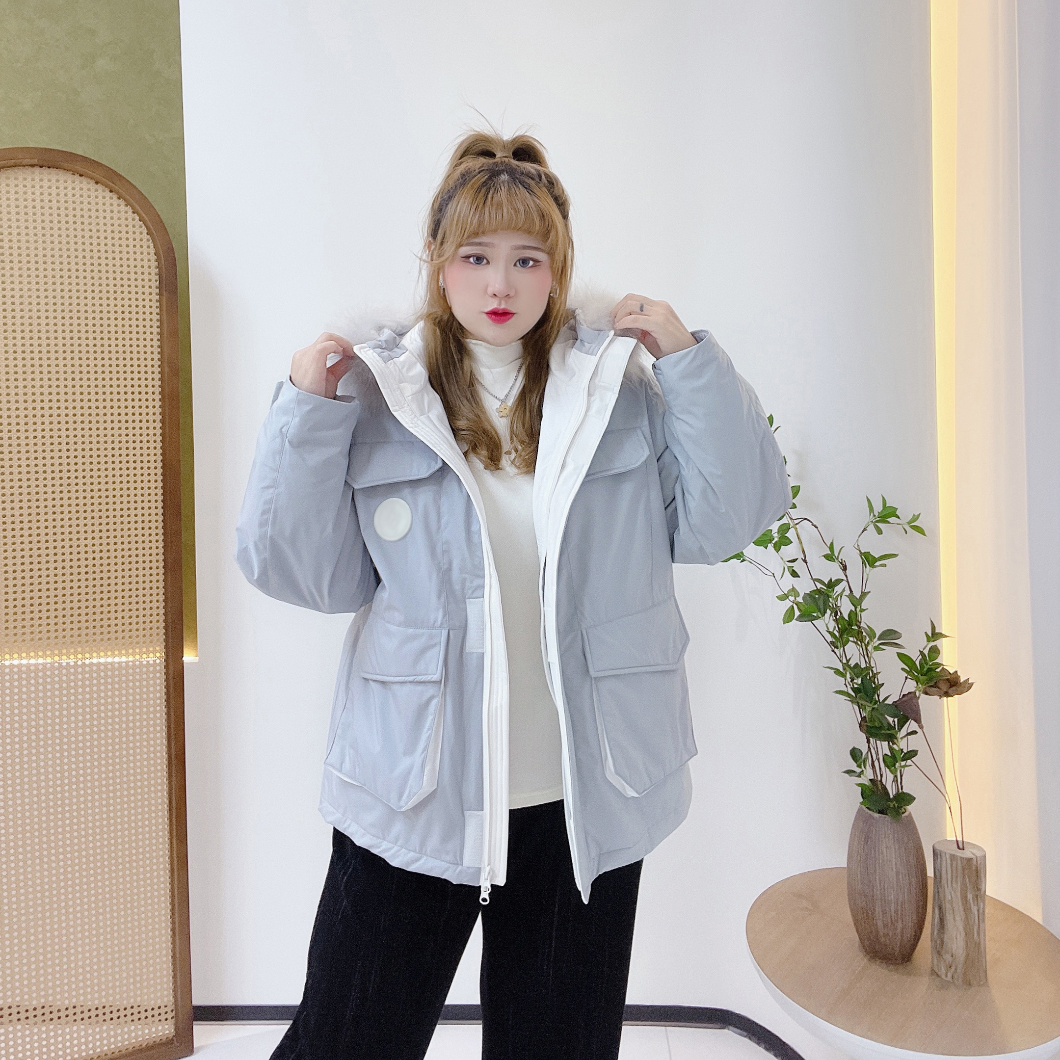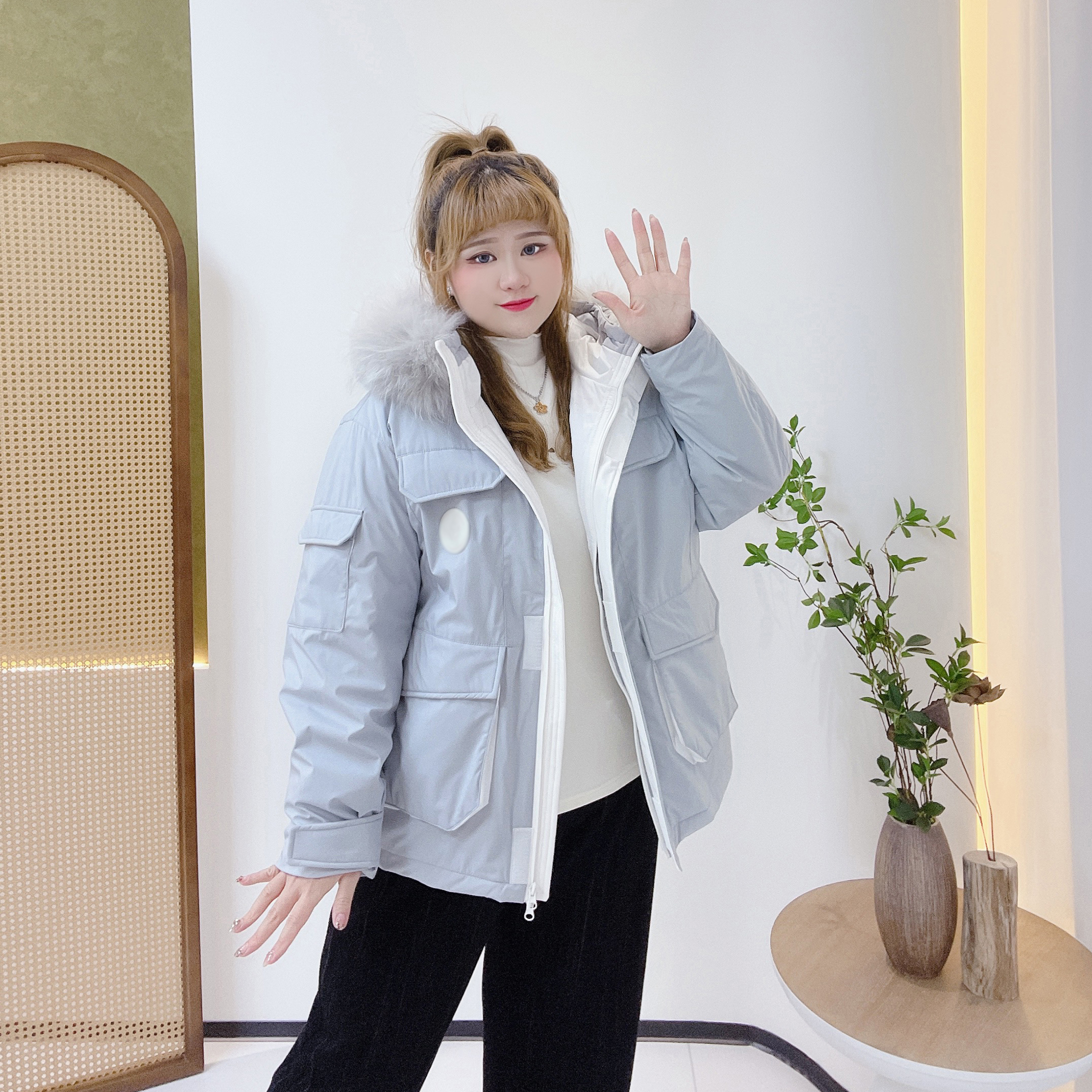 300斤胖莹莹大码女装加厚宽松东北减龄休闲工装派克大毛领羽绒服